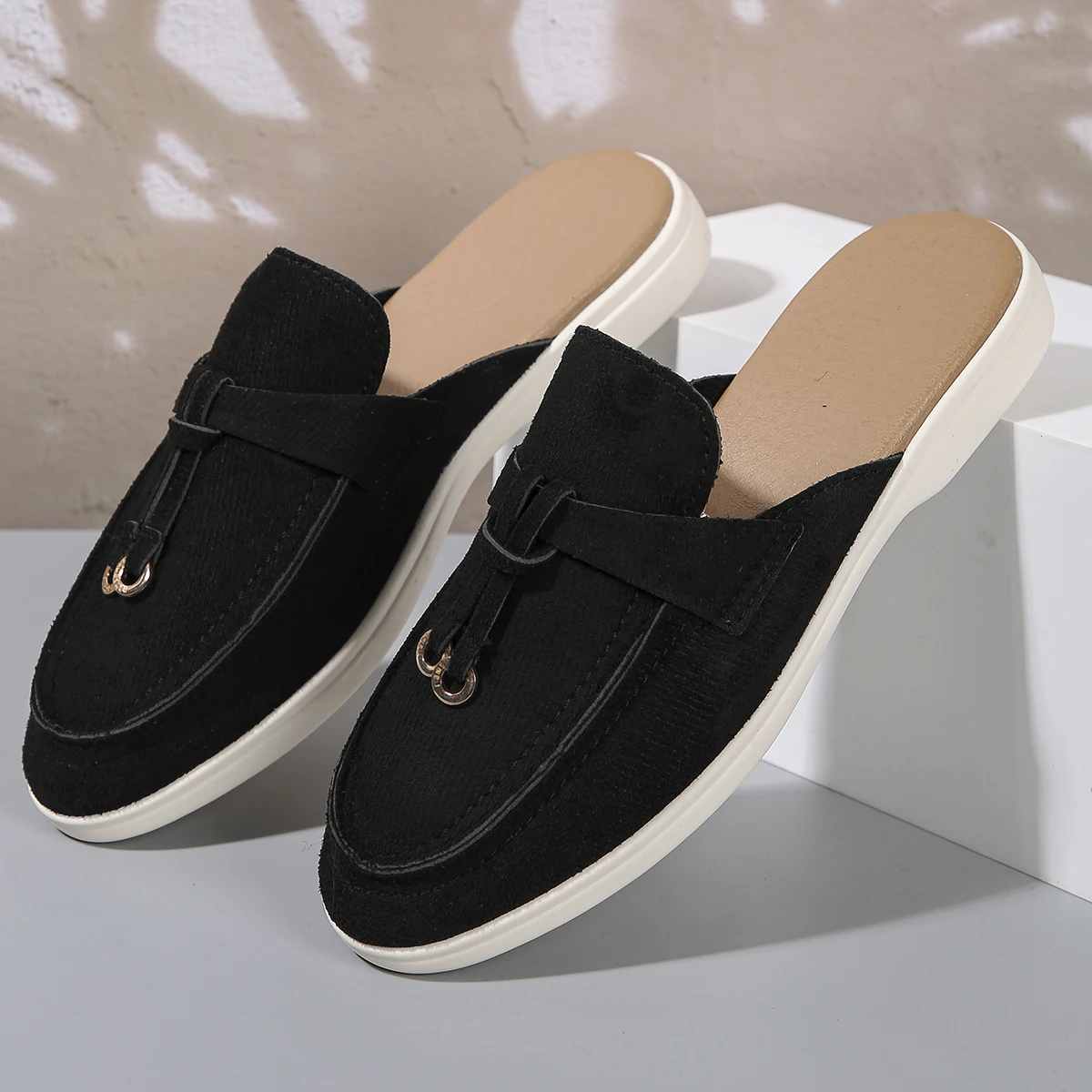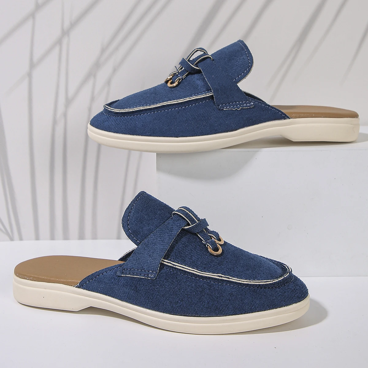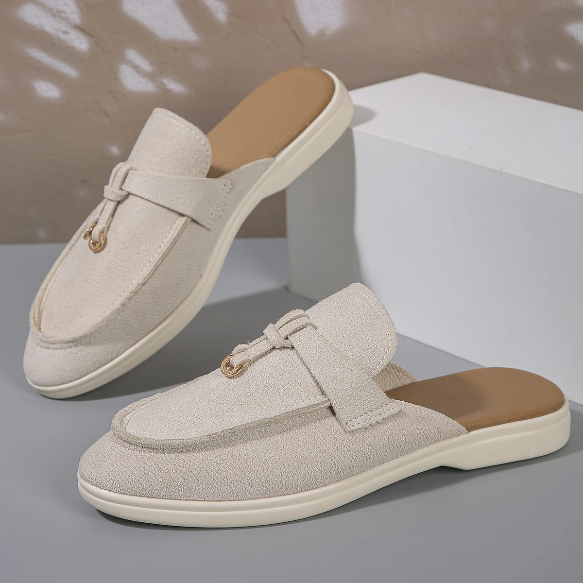 حذاء بدون كعب بنعل مسطح للنساء ، قفل بغال غير رسمي ، حذاء فردي ، إبزيم معدني ، انزلاق مريح ، علامة تجارية عصرية ، جديدة