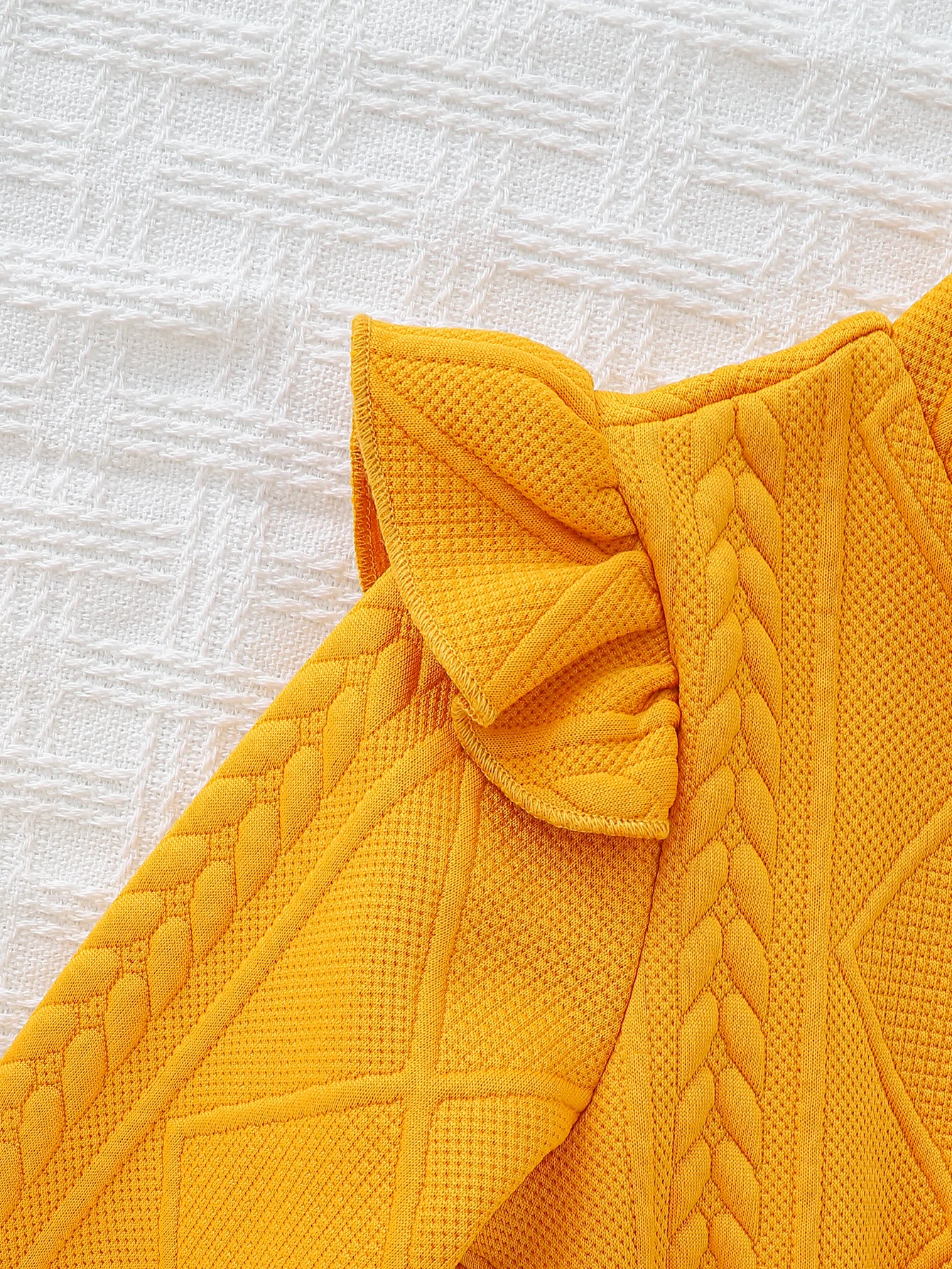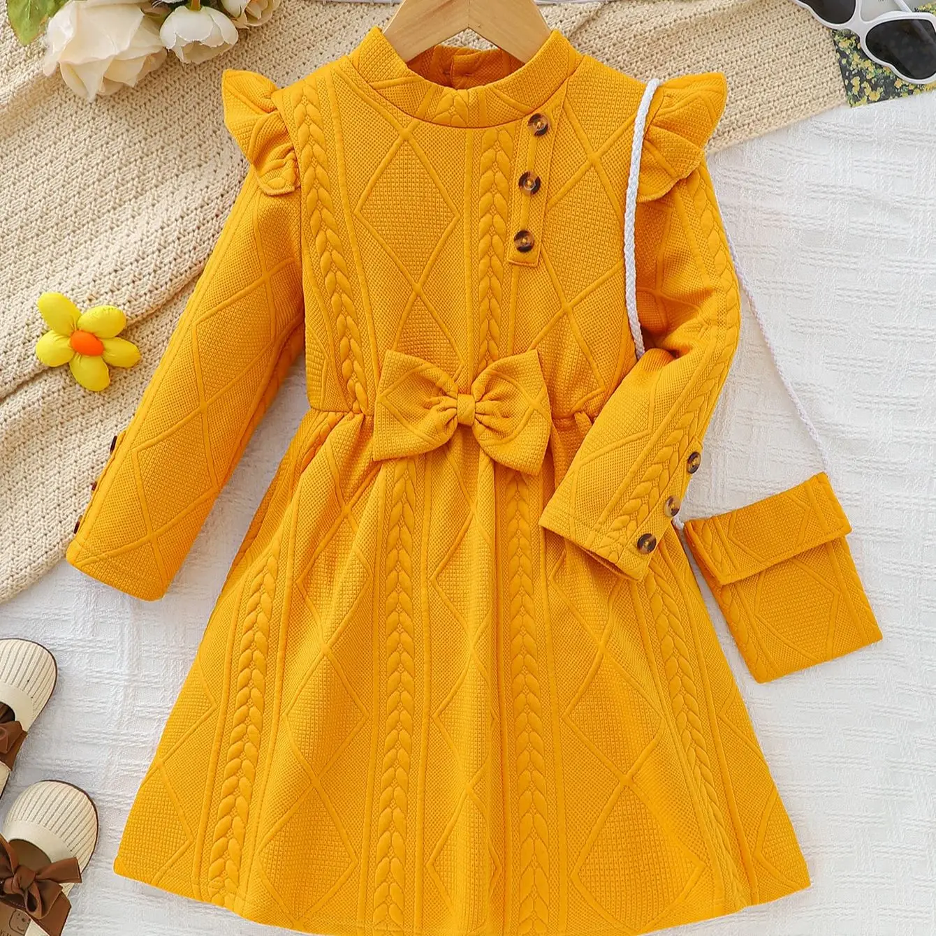 فستان بناتي صغير للخريف/الشتاء على شكل فراشة صفراء سميكة بأكمام طويلة + حقيبة