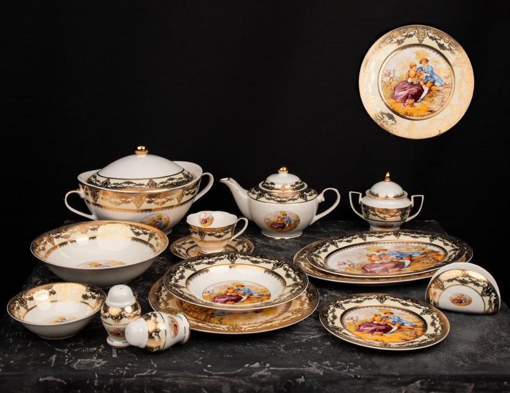 طقم سفرة الطعام من تحفة المائدة برسمة روميو وجوليت يتكون من 48 قطعة، مصمم لخدمة 6 أشخاص بأناقة ورقي. هذا الطقم يشمل الأطباق الرئيسية، الأطباق الجانبية، الصحون الصغيرة، والأكواب، مما يضمن إعداد طاولة طعام متكاملة. رسمة روميو وجوليت تضفي لمسة فنية رومانسية تجسد قصة الحب الخالدة، مما يجعل هذا الطقم خيارًا مثاليًا للمناسبات الخاصة والعزومات الفاخرة. بجودته العالية وتصميمه الفريد، يضفي هذا الطقم جواً من الفخامة والتميز على كل وجبة.