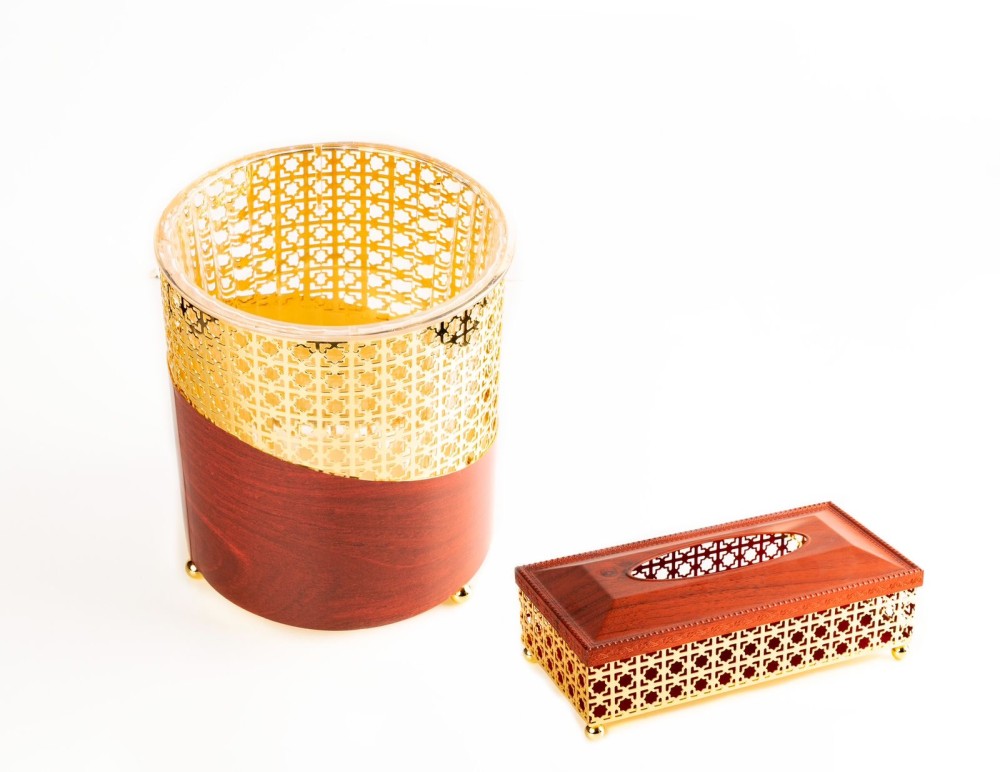 طقم سلة مع علبة مناديل خشب اسلامي ذهبي
