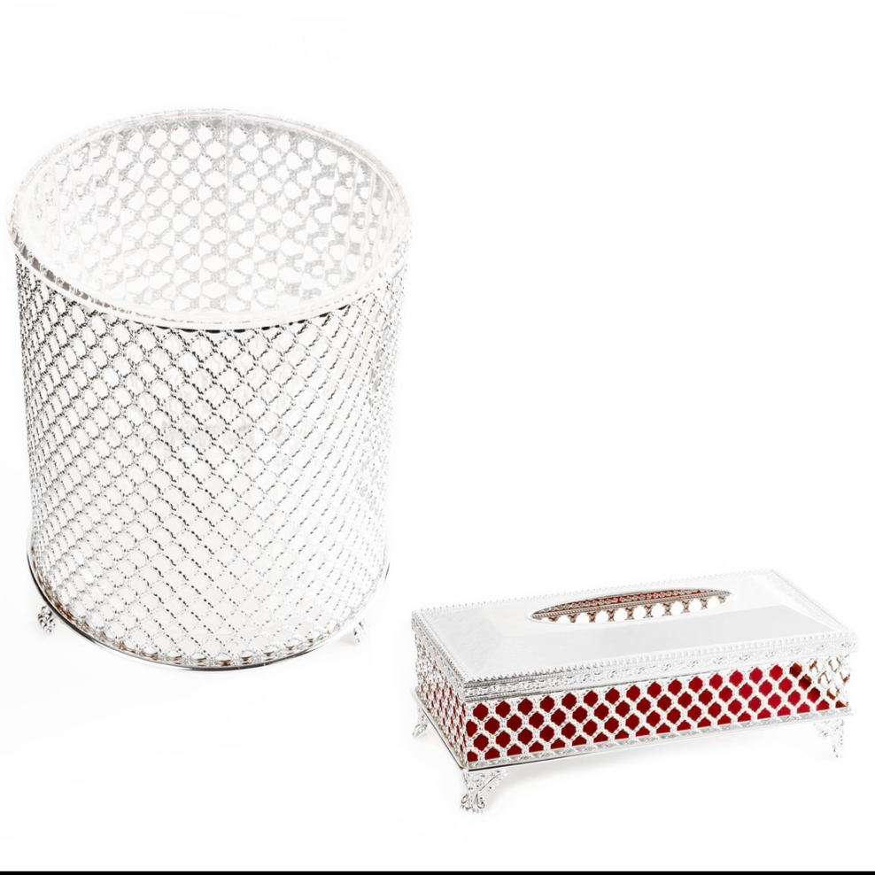 طقم سلة مع علبة مناديل شبك فضي