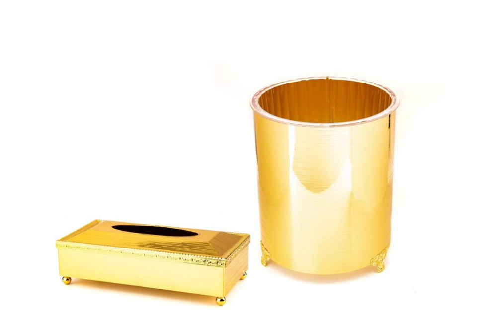 طقم سلة مهملات و علبة منديل خطوط ذهبي فاخر
