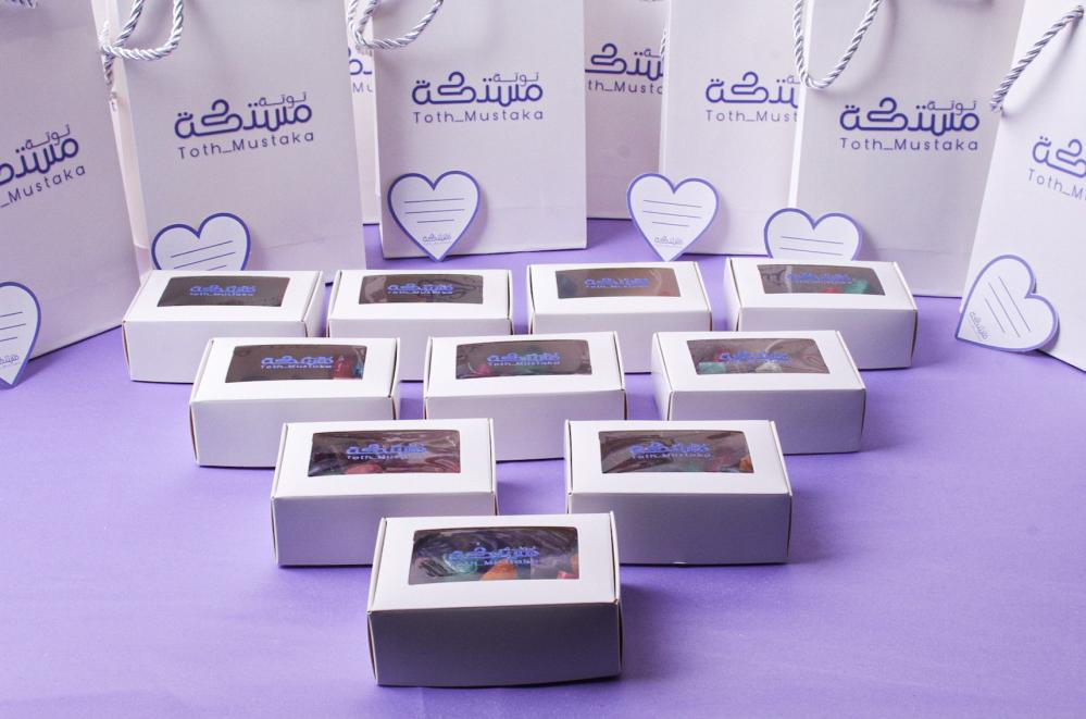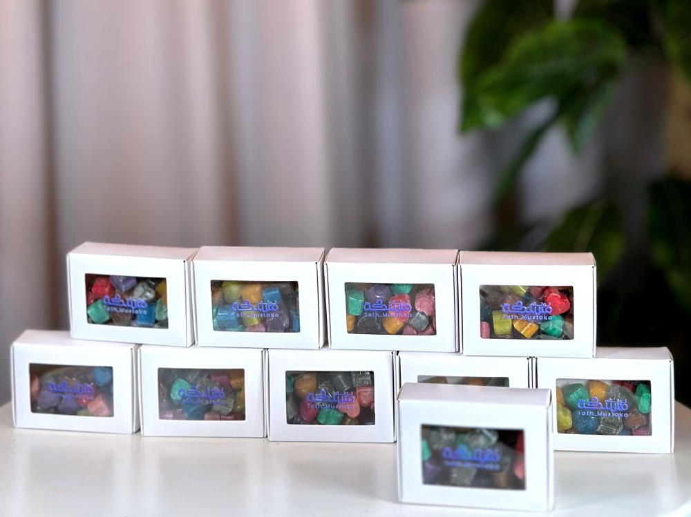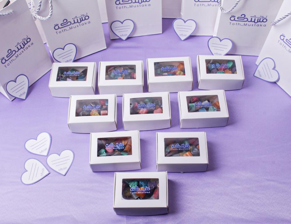 كل عبوة تحتوي على 30 حبة مستكة بجميع الروائح + كيس + بطاقة إهداء