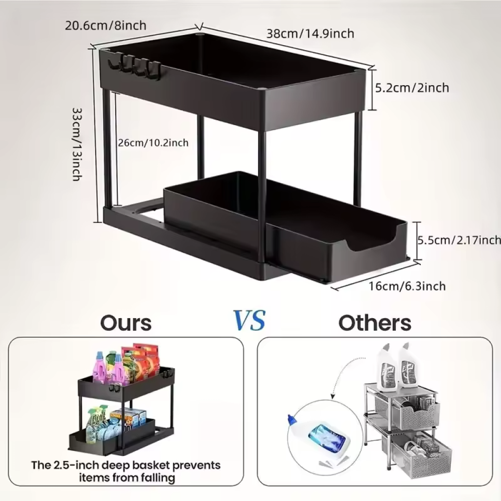وهو مناسب لمعظم الخزانات الموجودة أسفل الحوض، حيث يستخدم المساحة الموجودة أسفل الحوض بشكل فعال لتخزين مستلزمات التنظيف، مما يجعل أغراضك منظمة جيدًا ومخزنة بطريقة منظمة.قل وداعًا للمساحة المزدحمة.