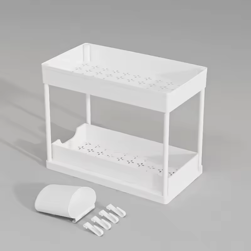 تم تصميم هذا المنظم الموجود أسفل الحوض بطبقة مزدوجة، مما يزيد من استخدام المساحة الرأسية. ويأتي مع 4 خطافات جانبية لتعليق بعض الأشياء الصغيرة، باستخدام المساحة المحدودة بشكل فعال.