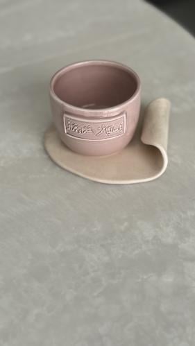 كوب مع طبق بعبارة (ليه أنا عيني تشوف وما تشوف إلا بهاكِ يا أجمل من الأخيله هذا جواب الاسئله)