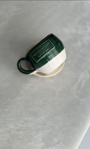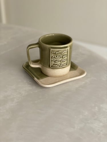 كوب مع طبق بعبارة ( ستدّنو إليكَ الأماني مخضرّة ويعقبُ صَبرك حُلمًا تورّدا)