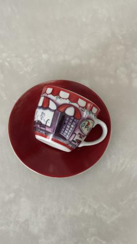 كوب مع طبق بعبارة (ليه أنا عيني تشوف وما تشوف إلا بهاكِ يا أجمل من الأخيله هذا جواب الاسئله)