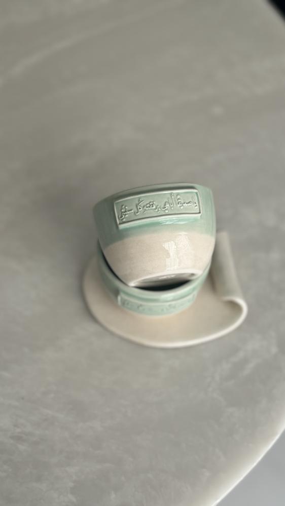 كوب مع صحن ملتف بعبارة ( يا صديقا اباهي برفقته كل سنيني)
