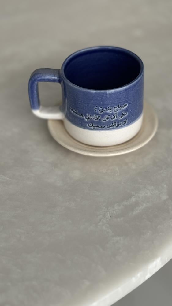 كوب مع طبق بعبارة (يا سالبًا قمَرَ السَّماءِ جَمالَهُ)