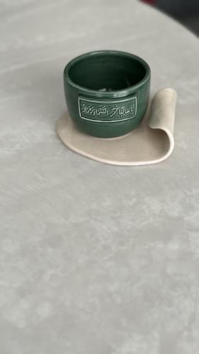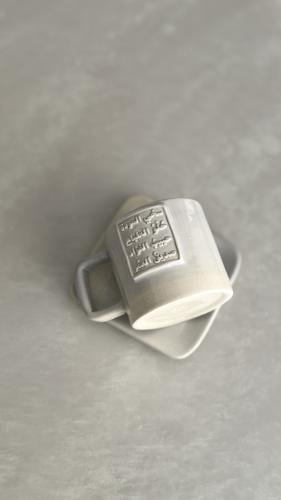 كوب مع طبق بعبارة (وتشاءُ أنت من البشائر قطرةً ويشاءُ ربُك أن يُغيثك بالمطر)