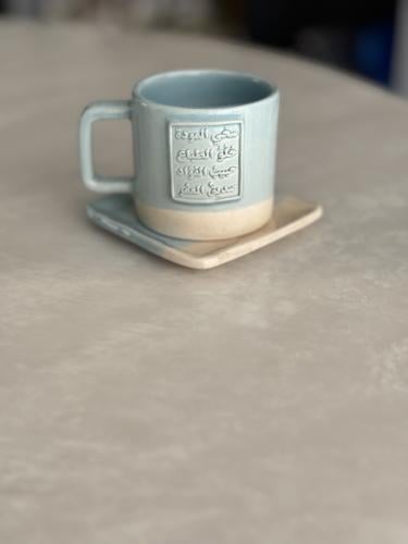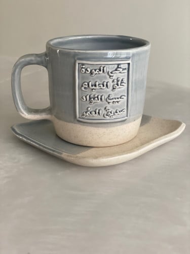 كوب مع طبق بعبارة (يا سالبًا قمَرَ السَّماءِ جَمالَهُ)