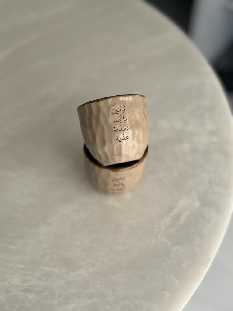 كوب مع طبق بعبارة (يا سالبًا قمَرَ السَّماءِ جَمالَهُ)