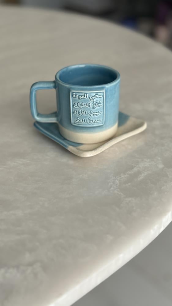 كوب مع طبق بعبارة ( ستدّنو إليكَ الأماني مخضرّة ويعقبُ صَبرك حُلمًا تورّدا)