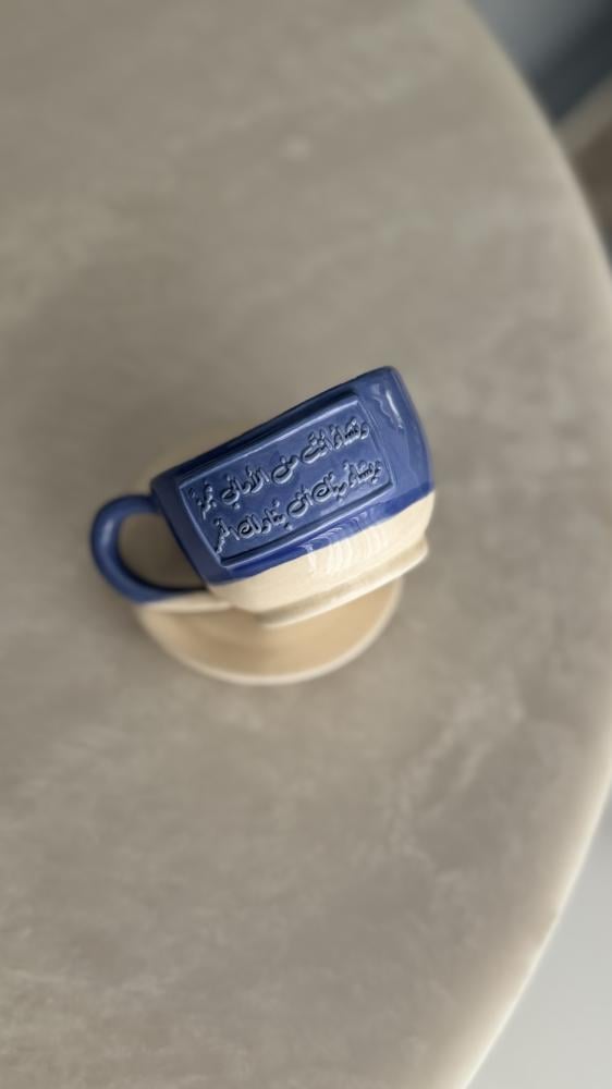 كوب مع طبق بعبارة ( ستدّنو إليكَ الأماني مخضرّة ويعقبُ صَبرك حُلمًا تورّدا)