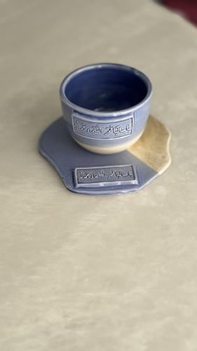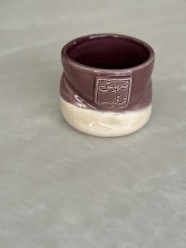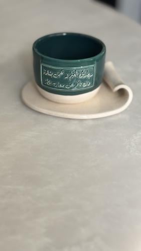 كوب مع طبق بعبارة ( وَكلُّ النَّاسِ يا أُمِّي مِياهٌ وَوحدَكِ زمزمٌ يروِي فؤادِي)