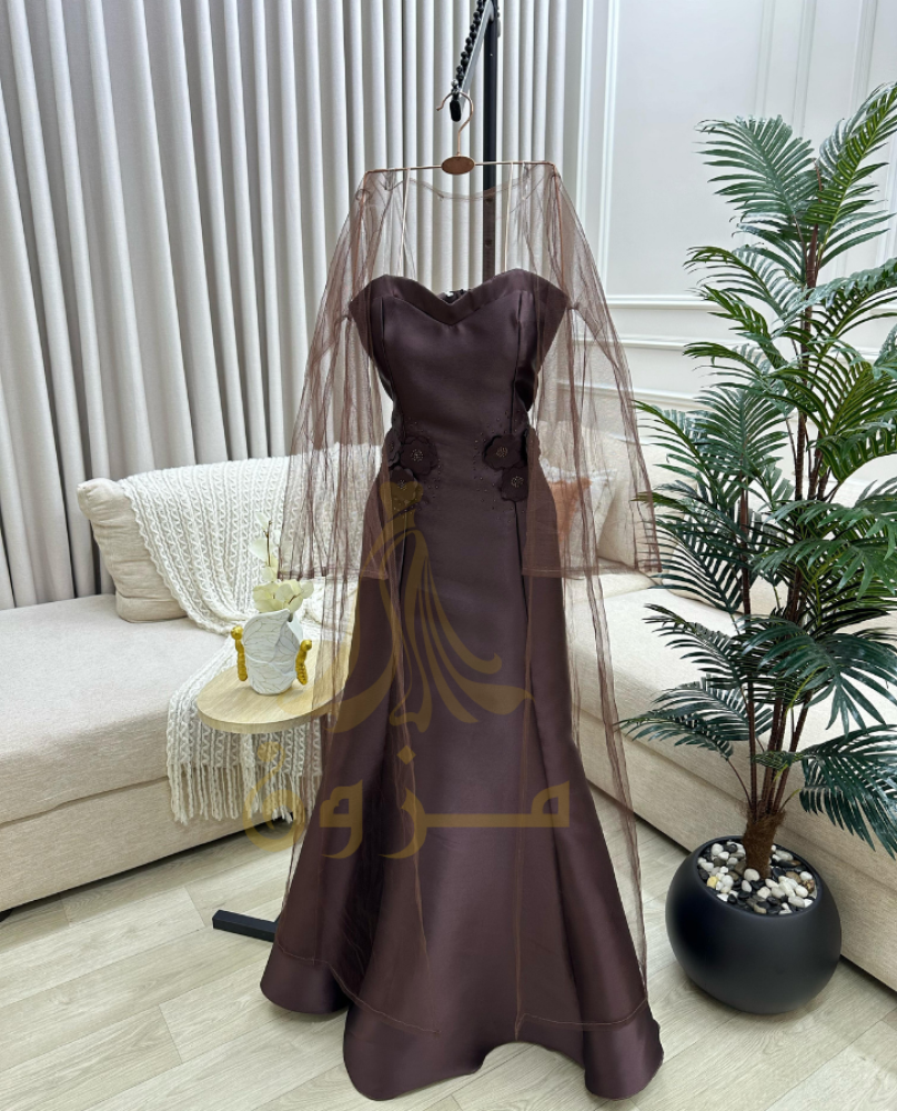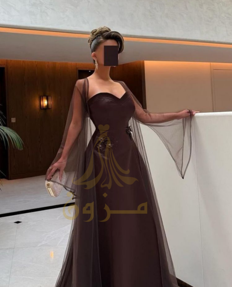 يتميز هذا الفستان الطويل بلونه البني الداكن (Chocolate Brown) وتصميمه المكون من قطعتين: فستان داخلي بقصة A-line وياقة على شكل قلب (Sweetheart Neckline)، مزين بتطريزات وردية بسيطة على الخصر. تكتمل الإطلالة مع كاب/شال (Cape/Shawl) طويل وشفاف من قماش التول، يغطي الكتفين والذراعين، ليضيف لمسة من الاحتشام والرقي الدرامي. صُنع الفستان الداخلي من قماش الساتان الثقيل. مثالي للحفلات المسائية، المناسبات الرسمية، وإطلالات العيد الفاخرة.