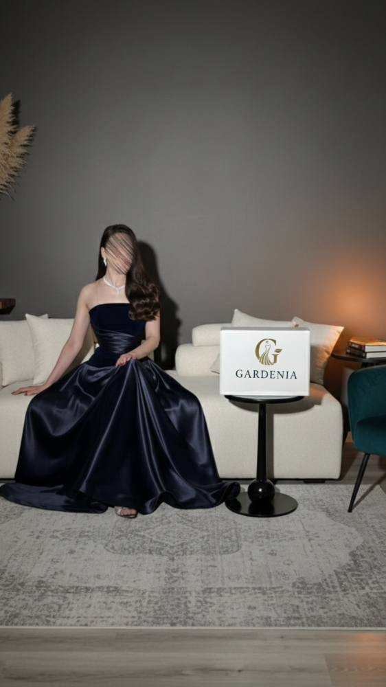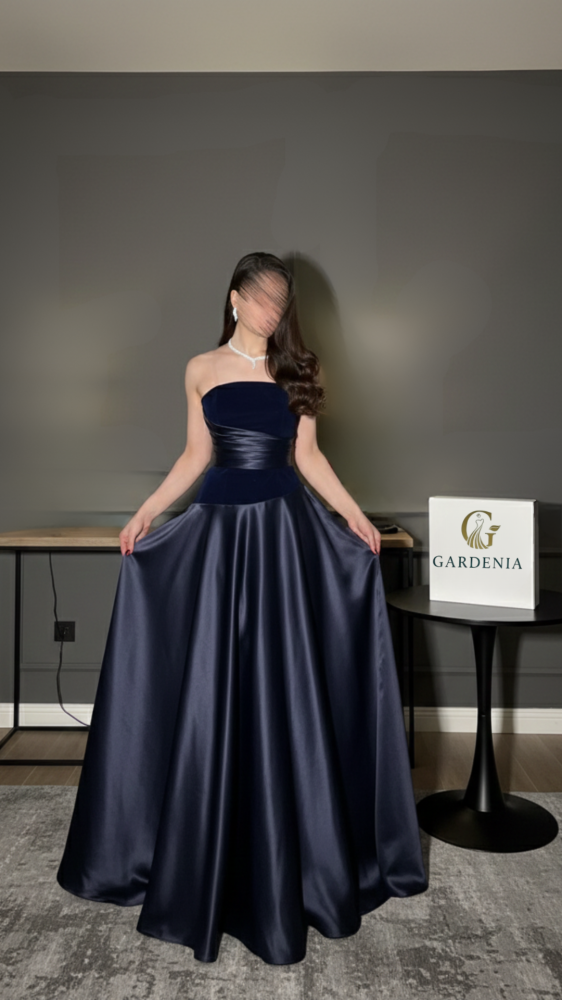 انغمسي في فخامة هذا الفستان الساحر المصمم بدمج فريد بين المخمل اللامع والساتان الحريري الانسيابي، بلون كحلي داكن راقٍ يناسب السهرات الفخمة. يتميز الجزء العلوي بتصميم كورسيه أنيق من المخمل يحدد الخصر، مع قصة مكشوفة الأكتاف (Strapless) وحزام عريض من الساتان يلتف حول منطقة الوسط.