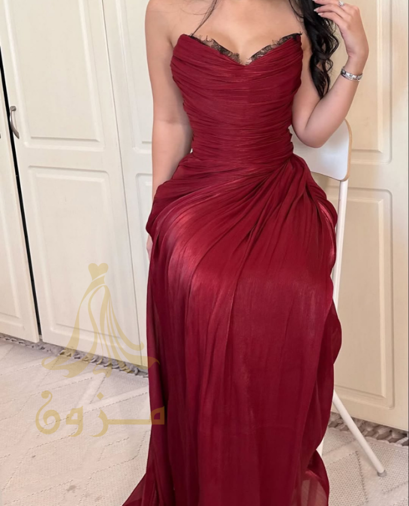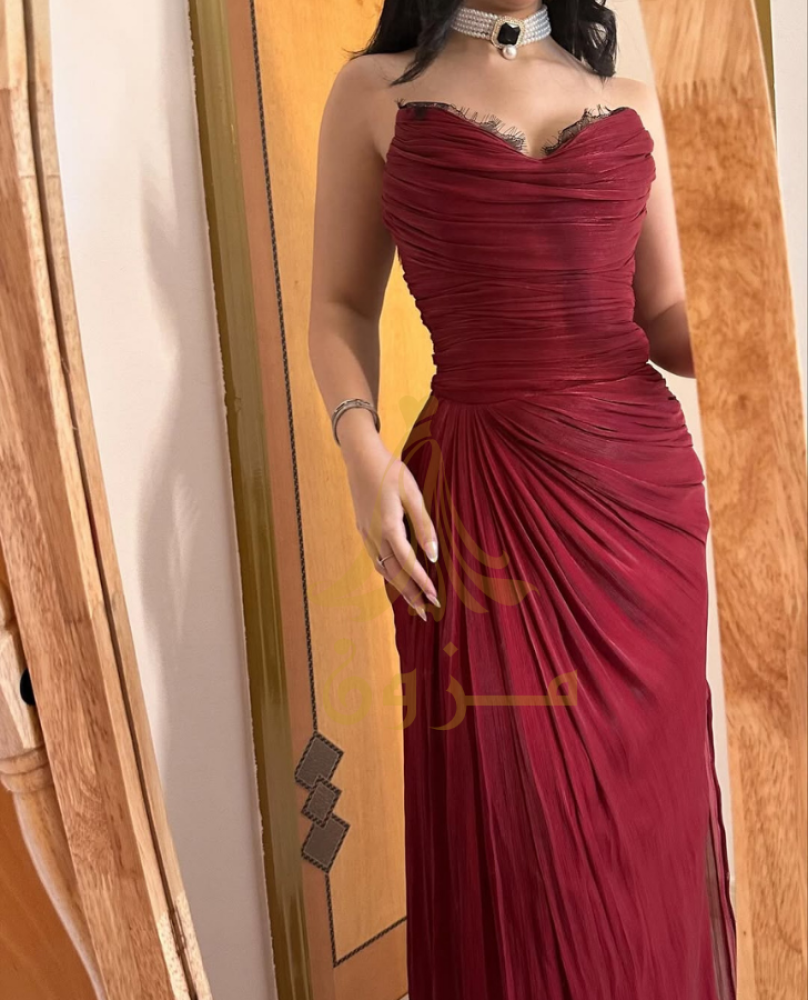 - القسم العلوي قصة بدون أكتاف (Strapless) مع تفاصيل كشكشة (Ruched/Draped) متقاطعة على الصدر والخصر، تبرز الأناقة.