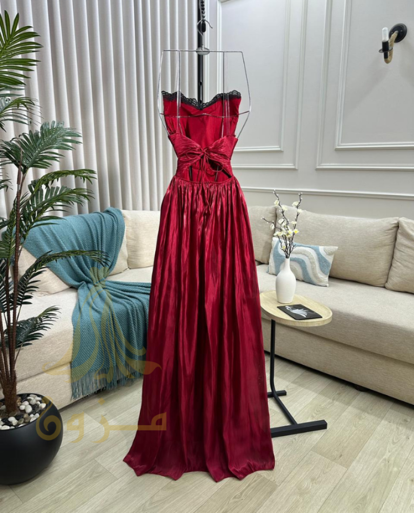 - الظهر تصميم مميز في الظهر برباطات متقاطعة (Criss-cross ties) تمنح الفستان لمسة جذابة ومفتوحة.
