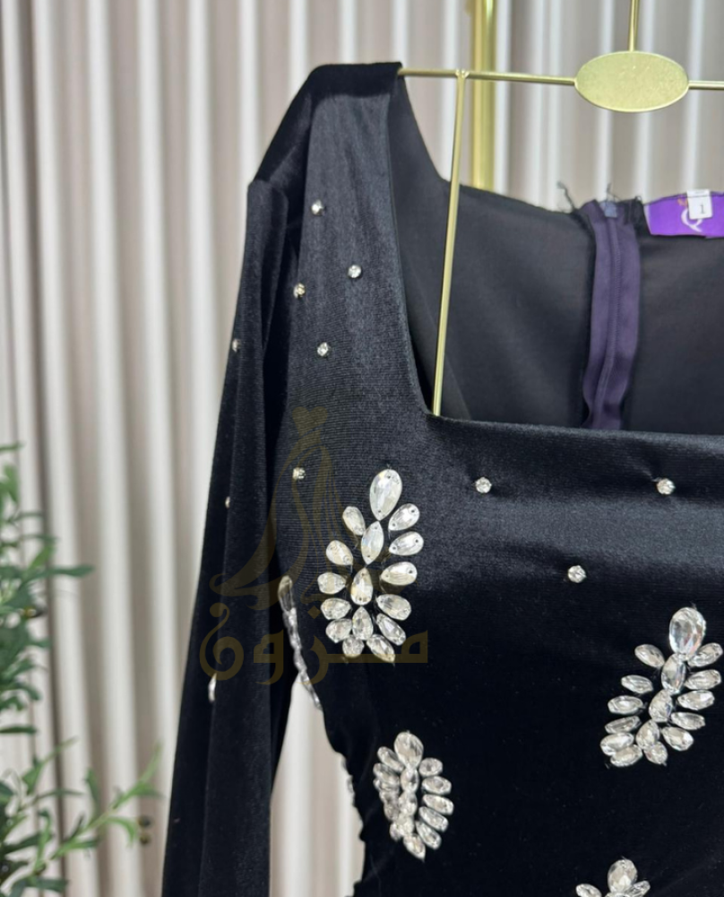 رتقي بمفهوم الأناقة الكلاسيكية مع فستان "الليالي السوداء". صُمم هذا الفستان بقصة مستقيمة ومحاكة من قماش الساتان الأسود الفاخر، ويتميز بياقته المربعة الجريئة والأنيقة. يتلألأ الجزء العلوي بـتطريز يدوي على شكل أوراق شجر باللون الفضي أو اللؤلؤ، مما يضفي لمسة من البذخ الراقي. تصميم خالد يجسد الفخامة ويجعل منكِ نجمة السهرة.