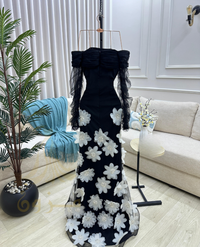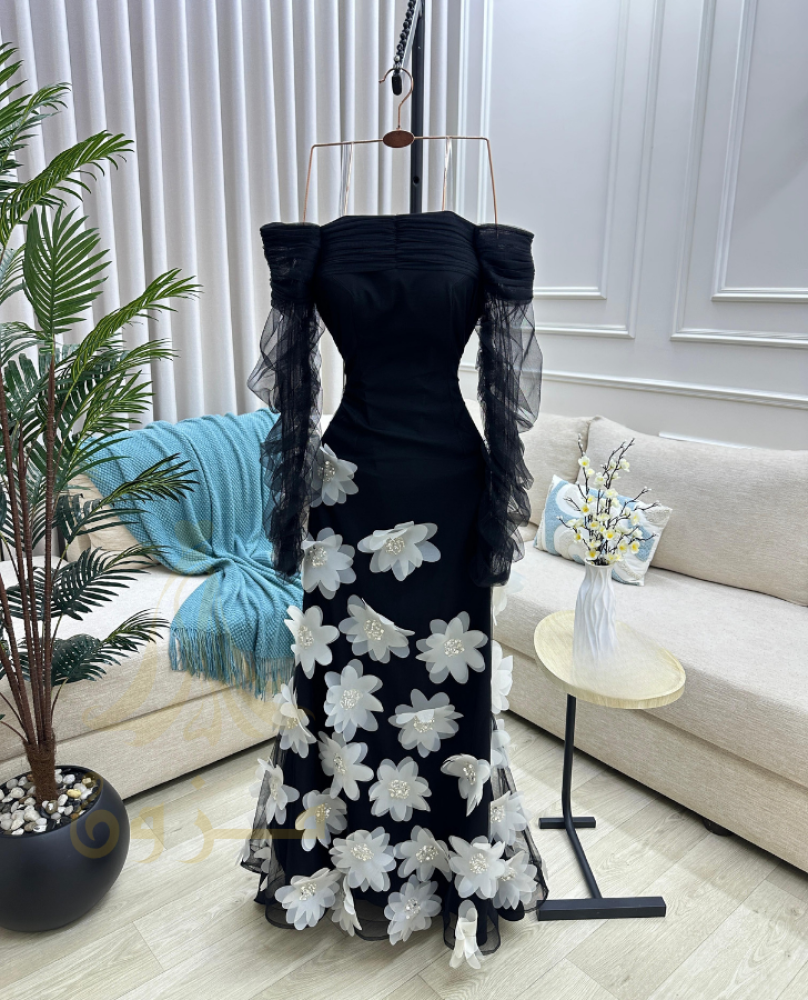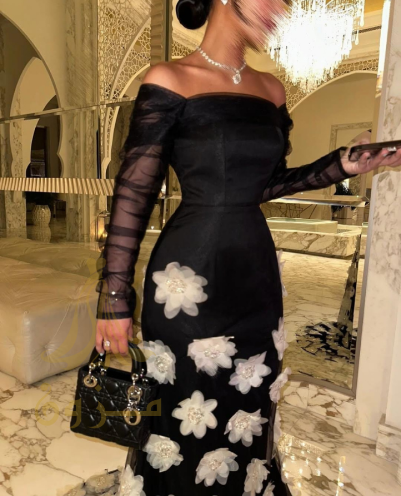 استسلمي لسحر فستان "زهور الليل" الذي يجمع بين الأناقة الجريئة والرومانسية الفاخرة. يتميز الفستان بقصة الأكتاف المنسدلة الساحرة والأكمام الطويلة من الشيفون الشفاف. لكن ما يميزه حقاً هو التطريز المتقن للورود البيضاء البارزة التي تزين التنورة السوداء، مما يخلق تبايناً مذهلاً. قطعة فنية تليق بسجادة الشهرة وتضمن لكِ إطلالة لن تُنسى.