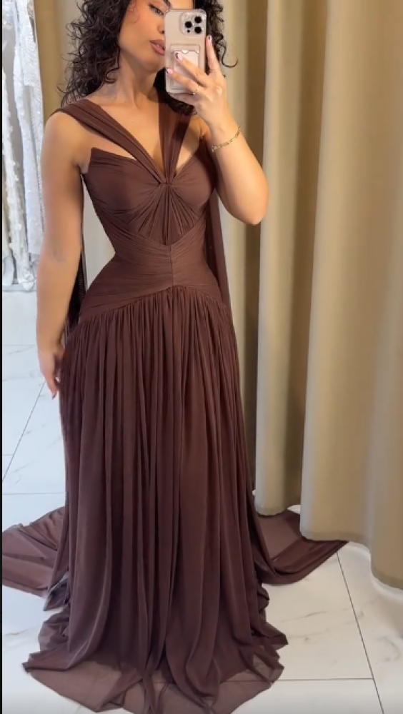 هذا الفستان الطويل هو قطعة سهرة فاخرة بلون البني الداكن (لون الشوكولاتة الغامق)، مصنوع من قماش الشيفون خفيف الوزن الذي يمنحه انسيابية ورونقًا في الحركة. يتميز الجزء العلوي (الصدر) بتصميم مُطوى ومُعقّد (Draped) عند خط الصدر، مع حمّالات أكتاف متقاطعة تُبرز الأنوثة. كما يتم تحديد الخصر بإحكام لخلق شكل الساعة الرملية. أما التنورة فتبدأ من الخصر وهي واسعة ومُنسدلة، تتميز بطيات عمودية وكثيفة تضفي عليها حجمًا راقيًا. يجمع الفستان بين الأناقة الكلاسيكية لموديلات السهرة والفخامة العصرية، مما يجعله مثاليًا للمناسبات الكبرى والحفلات الرسمية.
