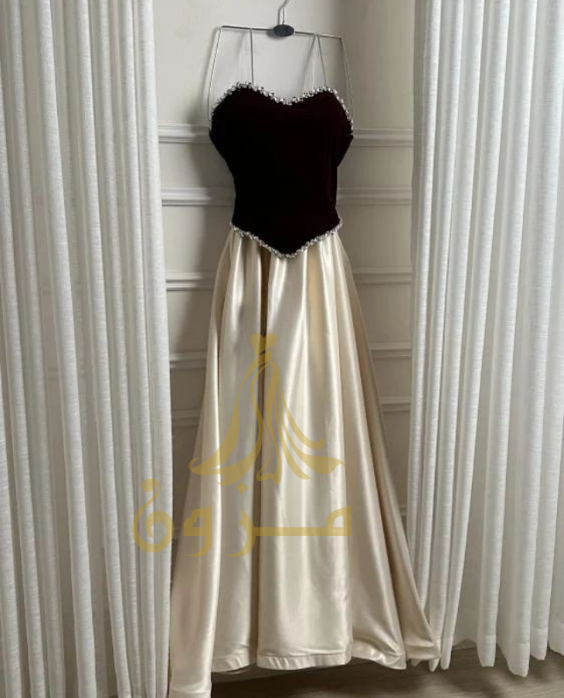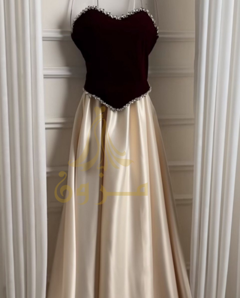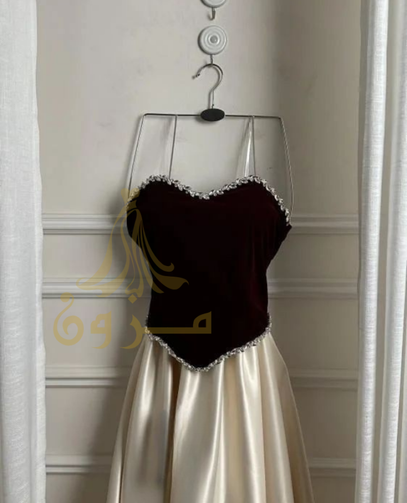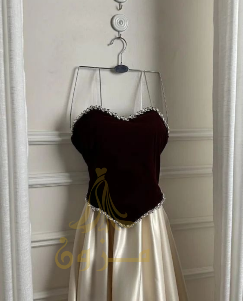 الوصف التسويقي: استمتعي بإطلالة تجمع بين الرومانسية والفخامة مع فستان "التقابل الفخم". يتميز الفستان بدمج رائع بين خامة المخمل العنابي الداكن في الصدر بقصة القلب الساحرة، والتنورة الواسعة المنسدلة من الساتان بلون البيج الناعم. يزين الفستان شريط من الكريستال المتلألئ عند الخصر والصدر، مما يخلق تبايناً مثالياً يجعلكِ محط الأنظار في أهم المناسبات.