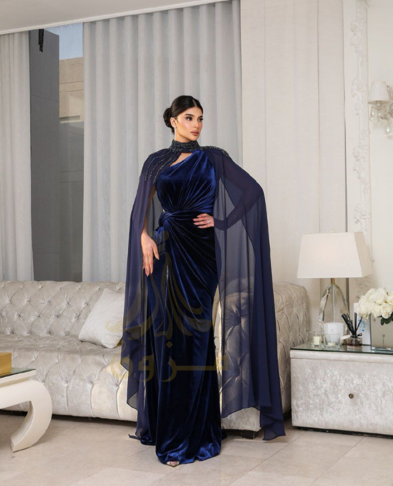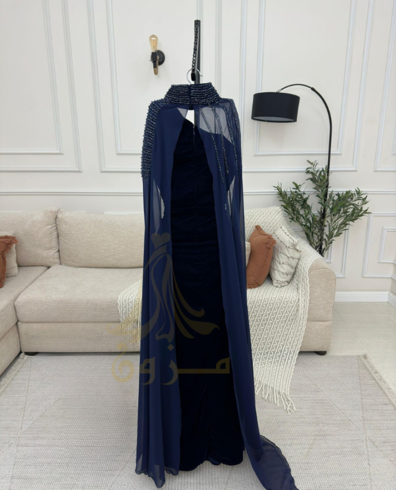 - الكاب كاب متصل من قماش الشيفون أو التول بلون كحلي مطابق، ينسدل بأناقة من الأكتاف ليضفي لمسة ملكية ودرامية.