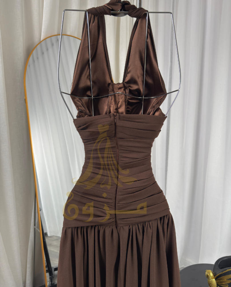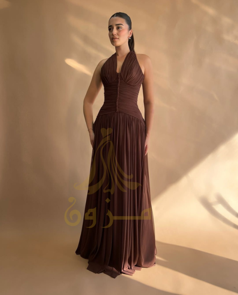 اكتشفي الأناقة الكلاسيكية بفستان "ترافل" بلون الشوكولاتة الدافئ. يتميز بقصة الهالتر الجذابة والتفاصيل المكشكشة في منطقة الخصر التي تنحت القوام ببراعة. ينسدل الفستان بحركة خفيفة وناعمة، مما يجعله مثاليًا للتحرك بأناقة وثقة في أي مناسبة. تصميم يجمع بين البساطة والرقي لإطلالة ساحرة