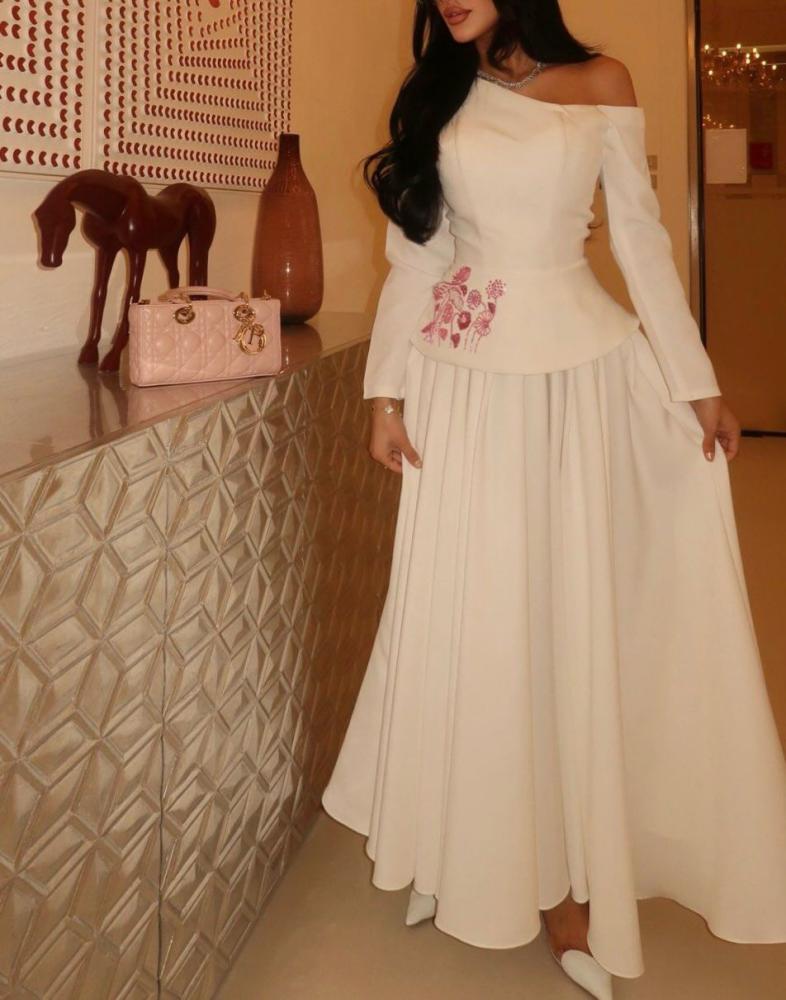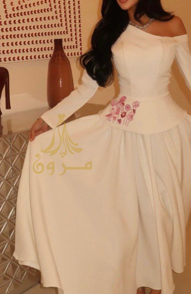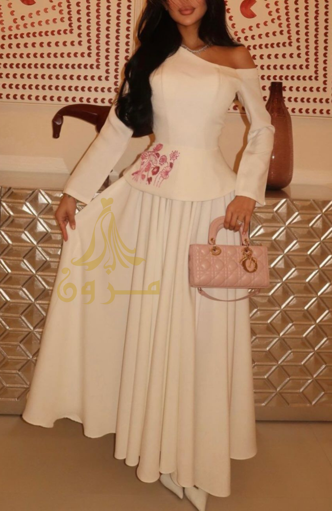 تألقي بإطلالة مفعمة بالرقة مع فستان "بيلا فلور" من مزون فاشن. يتميز هذا التصميم بقصة "الأوف شولدر" (Off-shoulder) العصرية مع أكمام طويلة تمنحكِ رقياً لافتاً. يبرز جمال الفستان بقطعة "البيبلوم" (Peplum) عند الخصر، والمزينة بتطريزات زهور وردية ناعمة تضفي لمسة فنية حيوية.