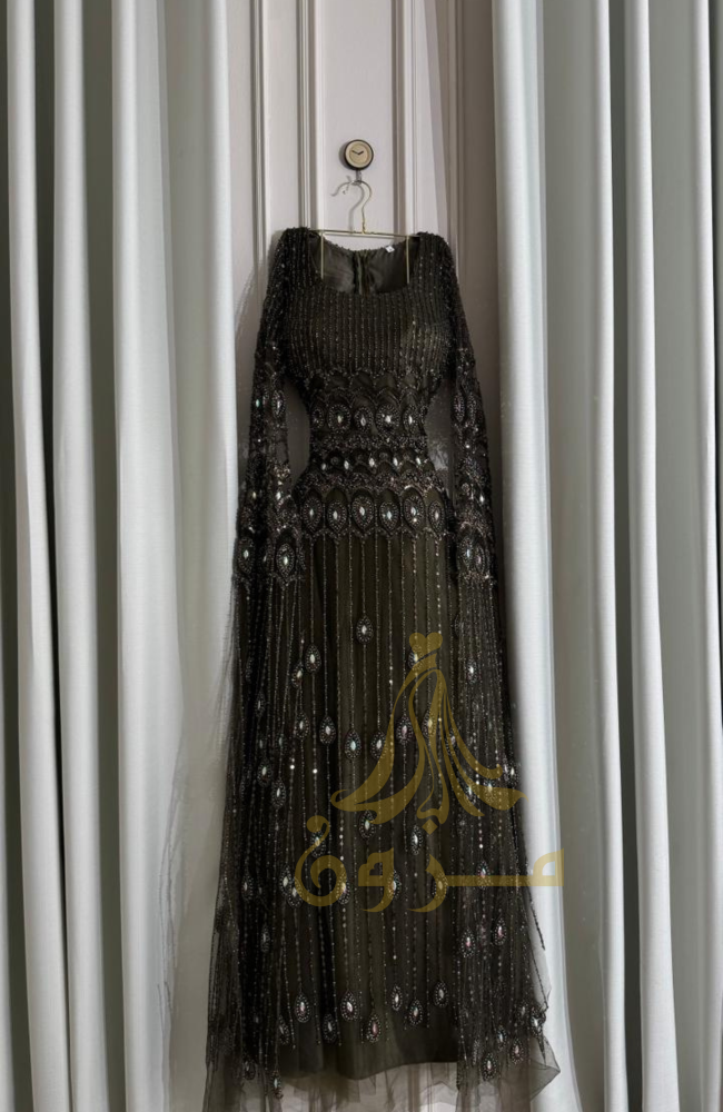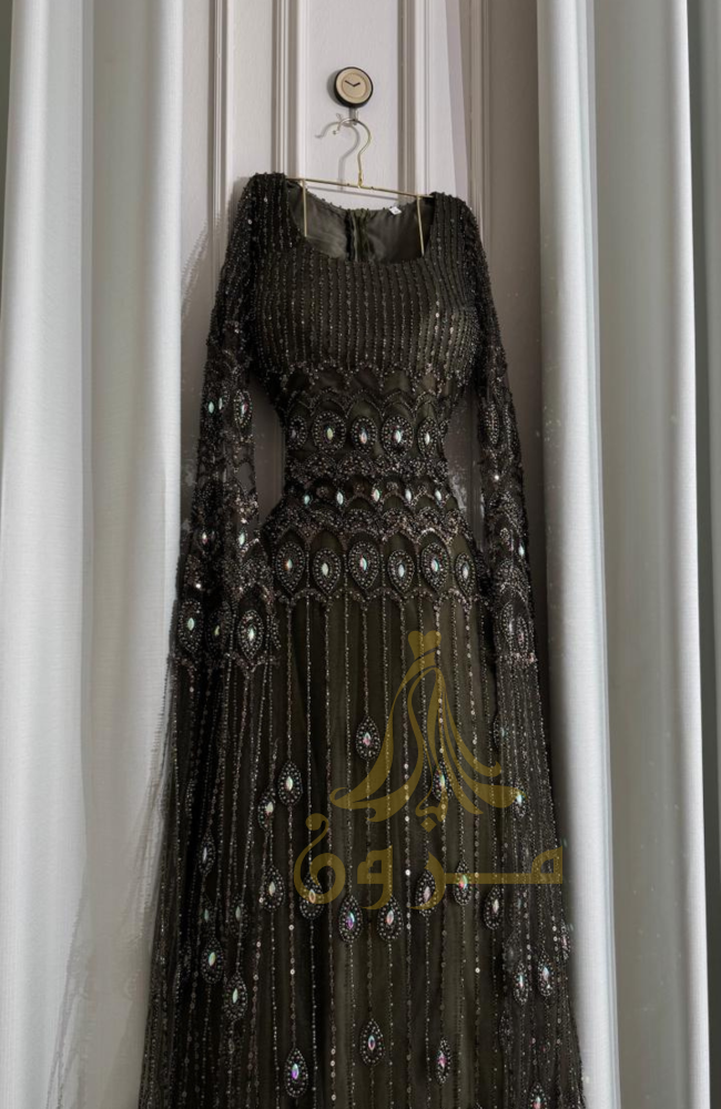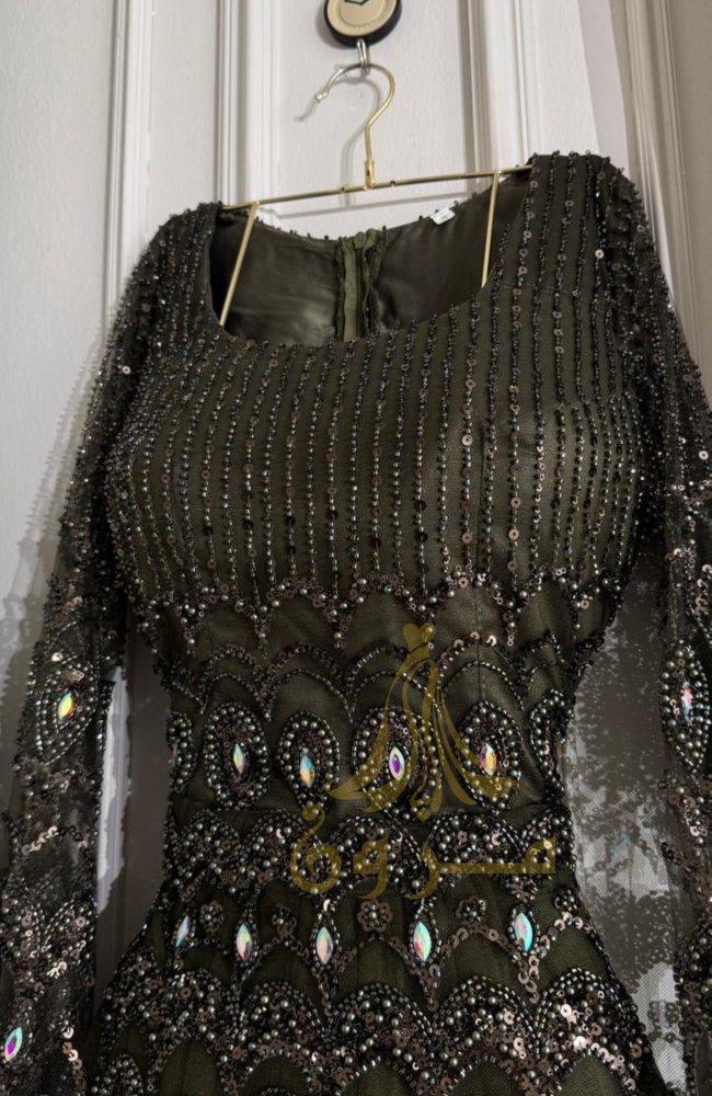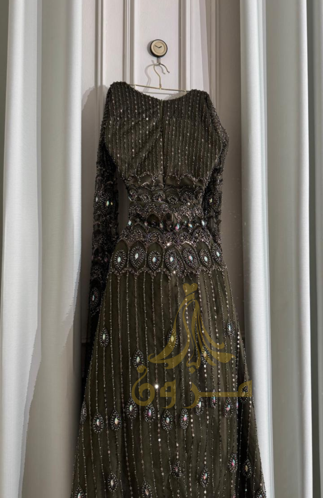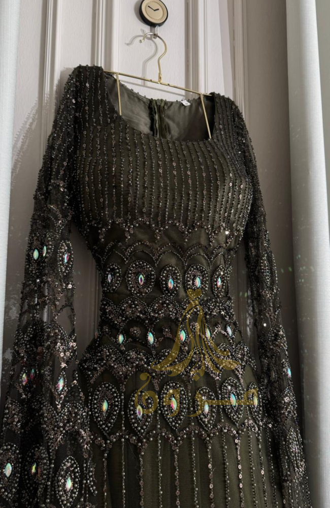 اجذبي الأنظار بإطلالة أسطورية من مزون فاشن مع هذا الفستان الساحر بلونه الأخضر الزيتي العميق. صُمم الفستان ليكون تحفة فنية، حيث يزدان بترصيع كامل يدوي من الخرز والكرستال اللامع الذي يمنحكِ بريقاً لا يُضاهى. يكتمل التصميم بأجنحة ملكية تنسدل من الأكتاف لتلامس الأرض، مما يضفي لمسة من الهيبة والفخامة على حضوركِ في أرقى السهرات.