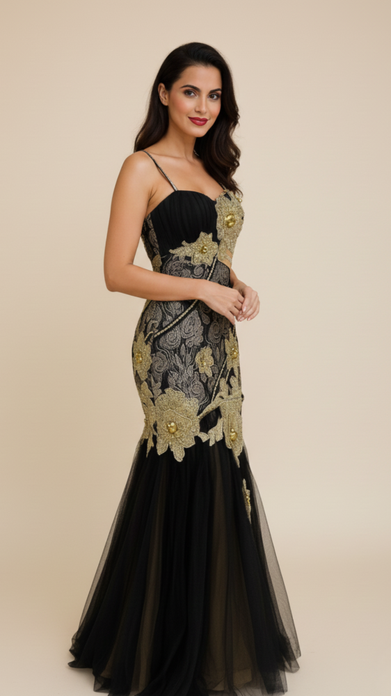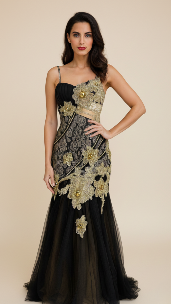 تألقي بإطلالة ملكية لا تُنسى مع هذا الفستان الساحر من غاردينيا . صُمم الفستان بدقة متناهية ليجمع بين كلاسيكية اللون الأسود وفخامة التطريزات الذهبية البارزة على شكل أزهار الأوركيد التي تمنحكِ مظهراً أرستقراطياً.