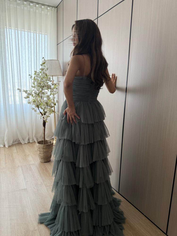تميّزي بإطلالة فريدة واستثنائية مع هذا الفستان الراقي المصمَّم بعناية ليتناسب مع أجواء السهرات والمناسبات الراقية. يتميز الفستان بتصميمه الطبقي المنسدل على شكل كسرات متتالية، تضيف له لمسة درامية وأناقة ملكية لا تُضاهى.