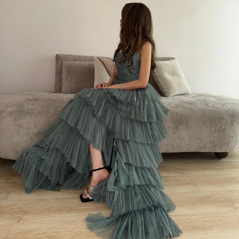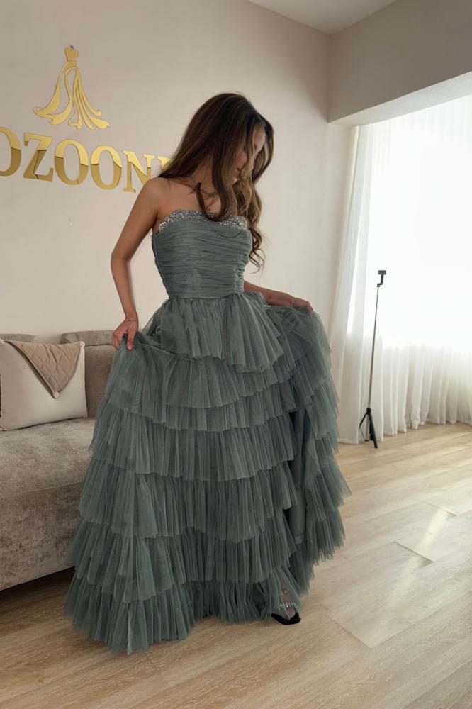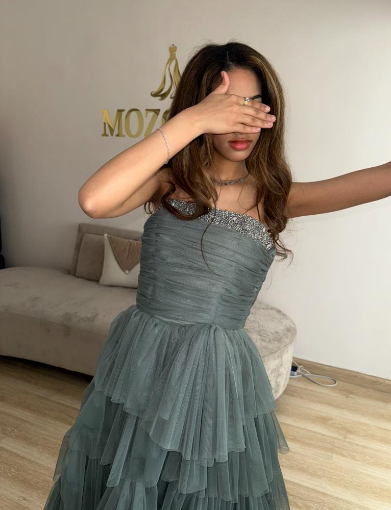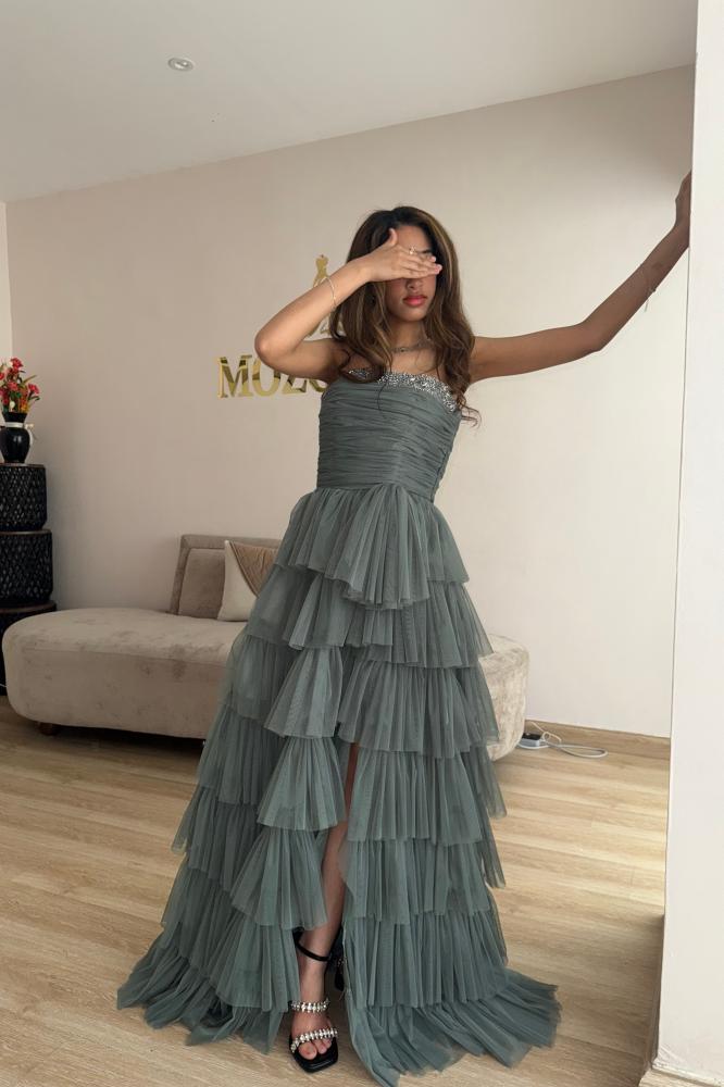 فستان سهرة فخم بطبقات كسرات – بتصميم مكشوف الكتفين ولون زيتي أنيق