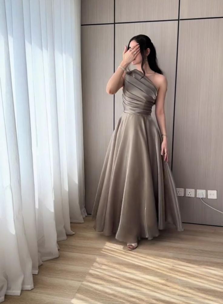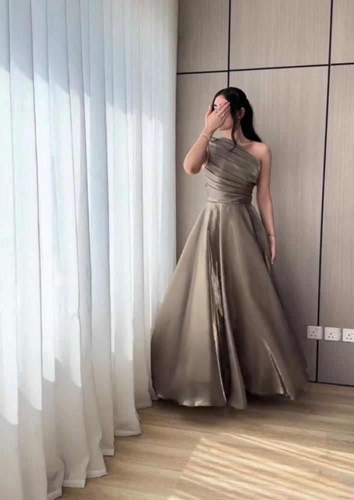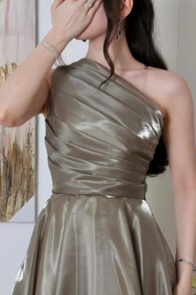 تألقي بسحر الفخامة مع فستان "البرونز الساحر" من Mazoon Fashion. هذا الفستان الطويل المصمم بقصة A-line الأنيقة يتميز بياقة كتف واحد (One-Shoulder) وتفاصيل كشكشة وكسرات بارعة على الصدر والخصر، تبرز جمال القوام. صُنع الفستان من خامة التافتا الفاخرة ذات اللمعة المعدنية، والتي تعكس لوناً برونزياً ذهبياً آسراً يضفي عليكِ إشراقة ملكية في أي مناسبة رسمية. مثالي لحفلات الزفاف والخطوبة والمناسبات الكبرى.