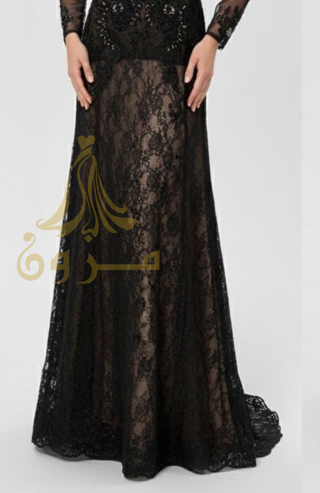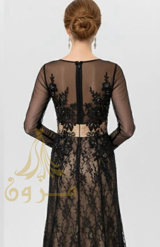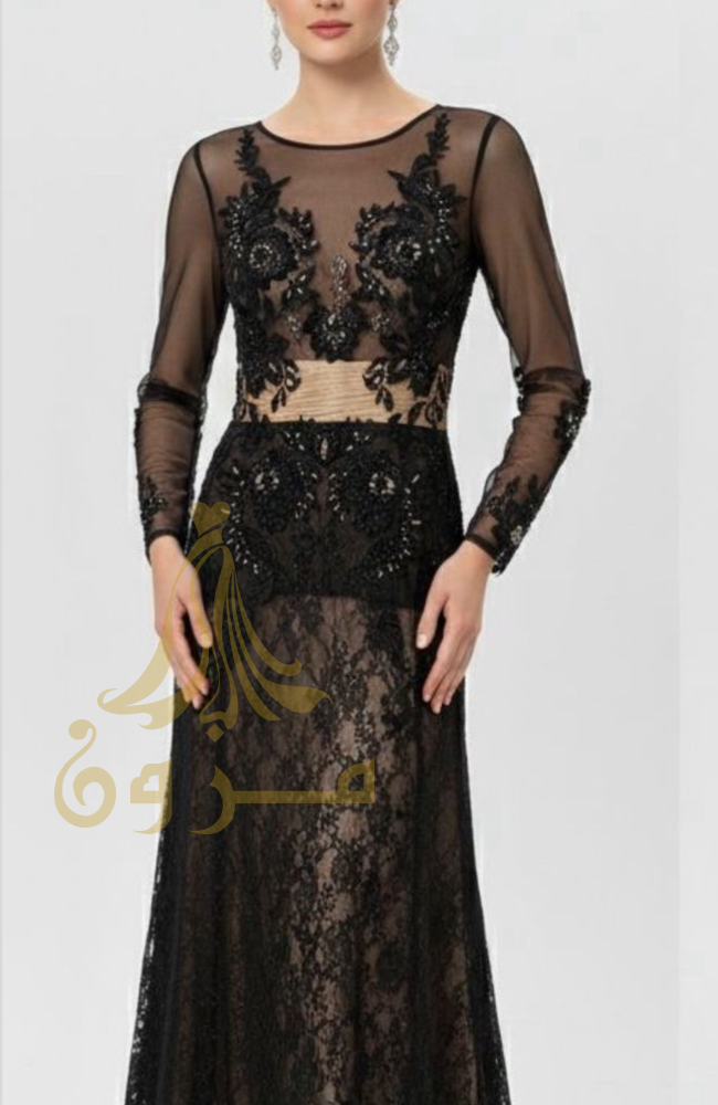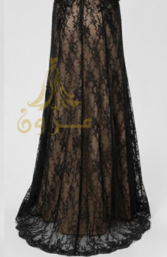 لقي بإطلالة ساحرة مع هذا الفستان الفاخر من مزون فاشن. يتميز التصميم بمزيج راقٍ من الدانتيل الفرنسي المبطن بلون نود دافئ، مع أكمام طويلة من الشيفون الشفاف المزين بتطريزات يدوية دقيقة من الخرز والترتر الأسود.