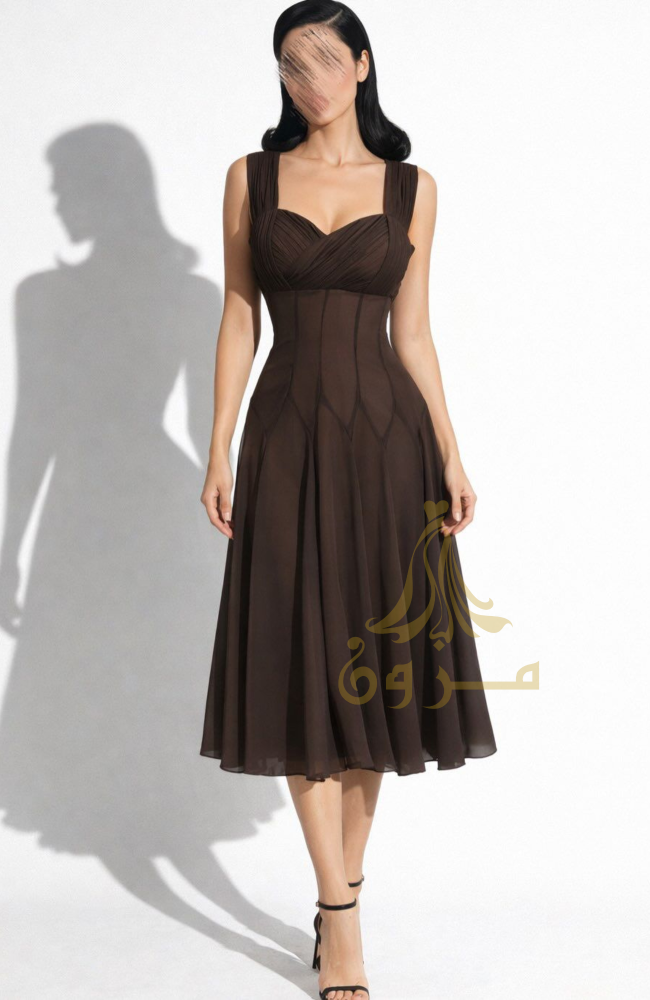 استمتعي بإطلالة أيقونية مع فستان "فيولا" (Viola) باللون البني العميق. يتميز هذا التصميم بصدر "درابيه" (Drapé) متداخل يبرز جمال التصميم، مع حمالات عريضة منسوجة بكسرات دقيقة. صُمم الخصر بنمط "المشد" (Corset-style) مع خطوط طولية فنية تمنحكِ قواماً منحوتاً وممشوقاً، لتنسدل بعدها التنورة الشيفونية بكسرات بليسيه ناعمة تضفي لمسة من الرقي والحركة.