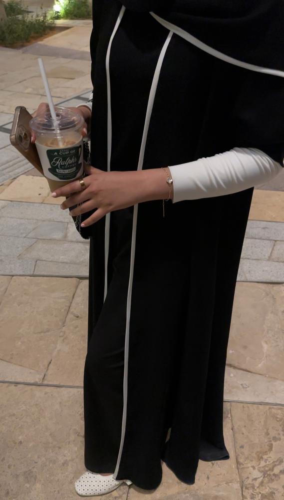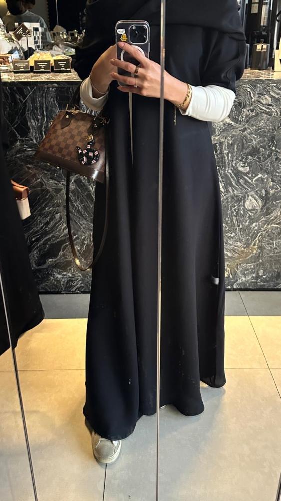 عباية أنيقة باللون الأسود بخامه إنترنت ناعم وانسيابي، بقصة نص كلوش تعطي اتساعًا راقياً ولمسة أنثوية جذابة.