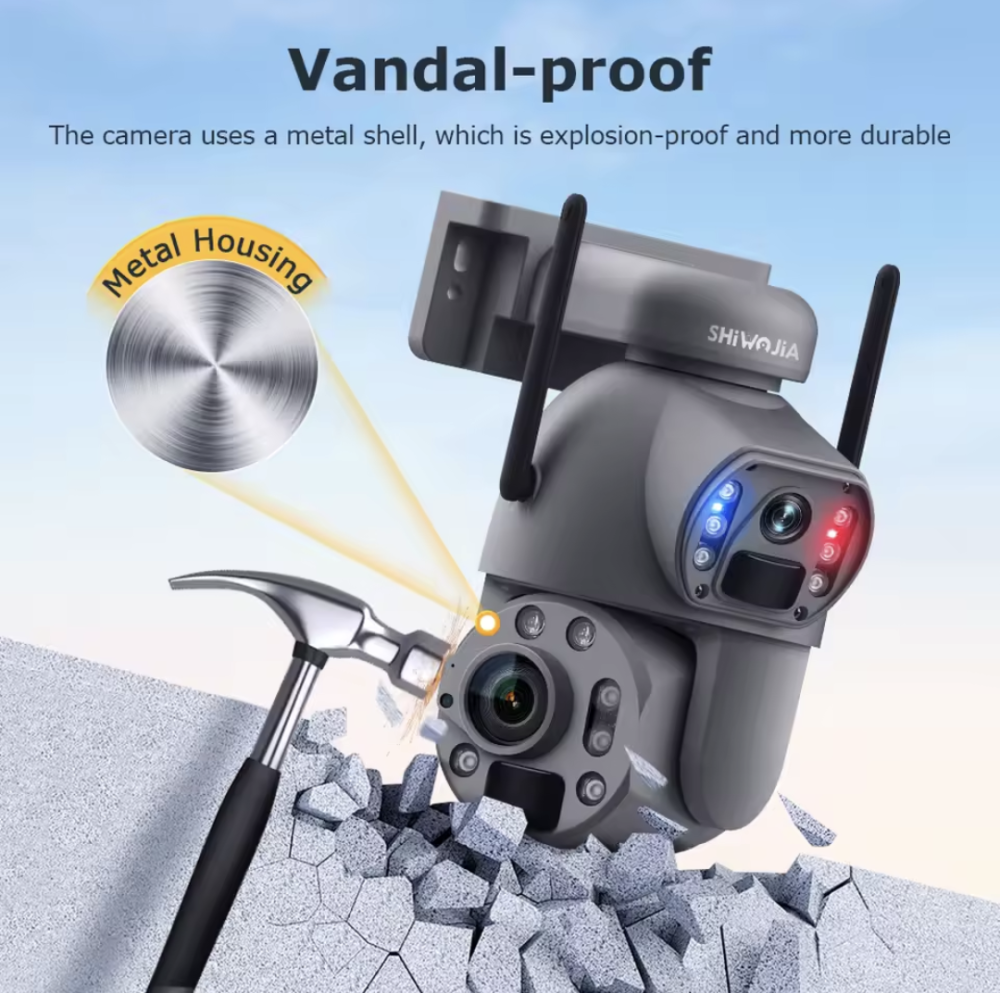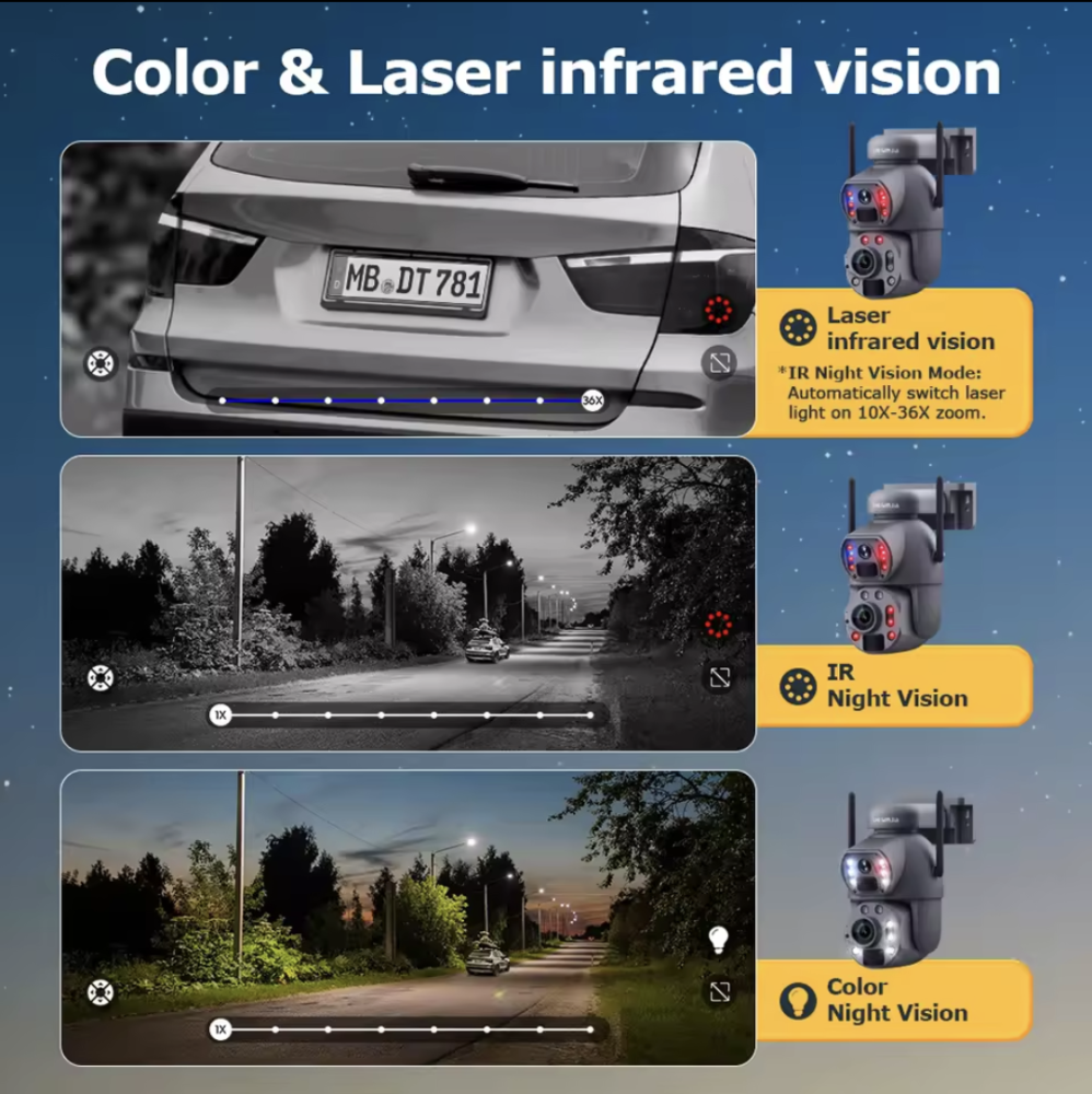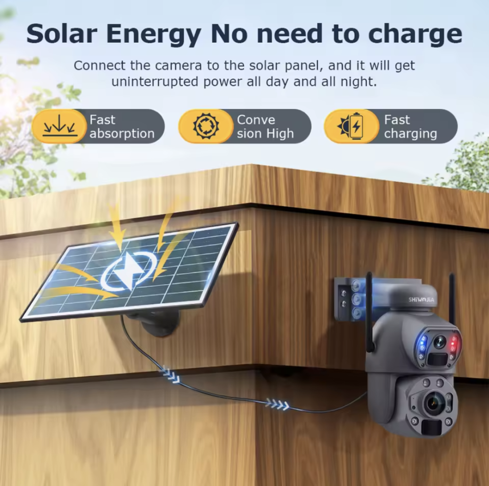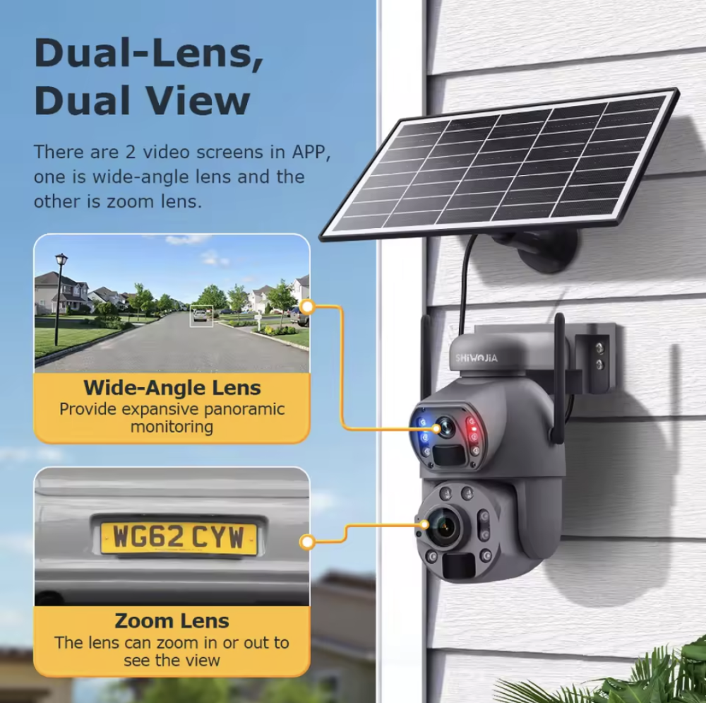 【تكبير 50X وعدسة مزدوجة 360 درجة° زاوية العرض: كاميرا شمسية مع تقريب رقمي 50X، تقريب بصري 50 + تقريب رقمي بوضوح على الأشياء البعيدة (يمكن رؤية رقم لوحة السياره). يدعم 355° أفقي و 90° دوران عمودي، يمكن التحكم فيه بسهولة من خلال التطبيق لالتقاط نطاق أوسع.
