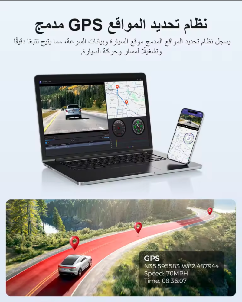 مدمج بها نظام لتحديد المواقع GPS يحفظ آليا الموقع والوقت والتاريخ خلال التسجيل ليمكنك لاحقا تتبع المسار على خرائط جوجل باستخدام تطبيق Azdome للجوالات أو Azdome GPS Player للكمبوتر.