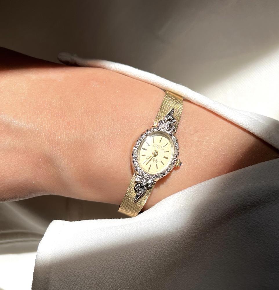 تتميز الساعة بسوار انسيابي ونحيف وعلبة بإيطار مرصع بعشر فصوص ألماس
