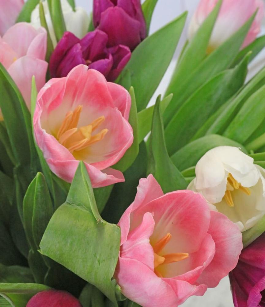 فازة تحتوي على عدد 25 وردة توليب بالألوان الوردي والأبيض والبنفسجي