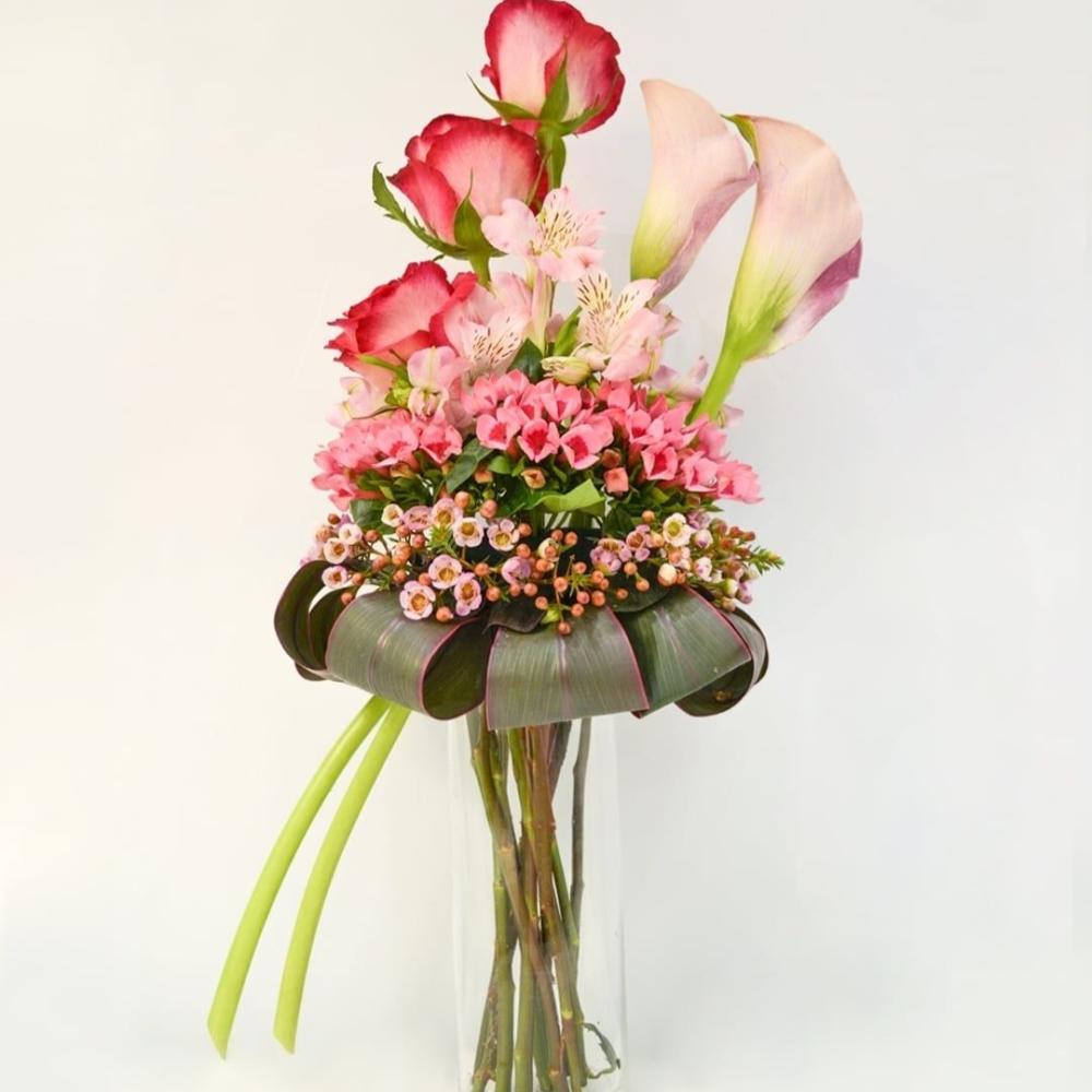 مجموعة من زهور الجوري الوردي والكالا واسترميريا والواكس والخضارات المميزة تنسيق الزهور الطازجة يعتبر فناً يتطلب الذوق الرفيع والاهتمام بأدق التفاصيل لخلق تجربة بصرية تبهر الناظرين. إن مجموعة من زهور الجوري الوردي والكالا واسترميريا والواكس تعتبر اختيارًا مثاليًا لإنشاء تنسيق جذاب وراقٍ. تبدأ الزهور الجوري الوردي بإضفاء لمسة من الأناقة والرقي على الرسالة التي تحملها الزهور، بينما تضيف زهور الكالا لمسة من الأناقة والجمال بتفردها وتميزها. وتأتي زهور الاسترميريا لتضفي لمسة من الأناقة الخالدة والفخامة، بينما تضيف زهور الواكس التفاصيل الدقيقة والأناقة البسيطة إلى التنسيق. إضافة الخضارات المميزة إلى التنسيق تعتبر لمسة إبداعية ومبتكرة،حيث يمكن استخدامها لإضفاء توازن إلى الباقة الزهرية وإبراز جمال الزهور بشكل أكثر بروزًا. تنسيق زهور جميل يعكس الذوق الرفيع والاهتمام بالتفاصيل، ويمكن أن يكون هدية مثالية لمناسبة خاصة أو لتزيين المنزل بأناقة وجمال.