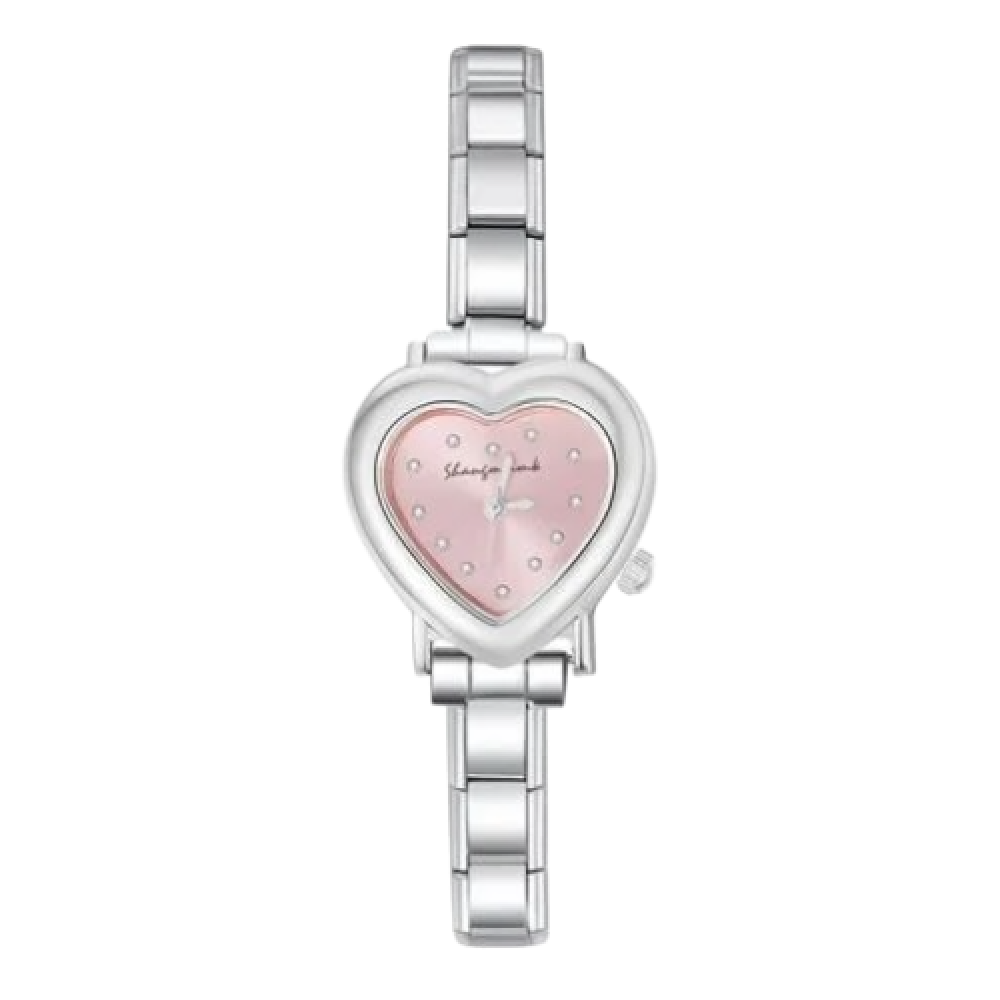 تألقي بلمسة أنثوية ساحرة مع هذه الساعة الفضية الفاخرة بتصميم قلب فريد ومينا وردي لامع مرصع بحبات كريستالية دقيقة. مزيج مثالي من النعومة والرقي، تضيف لمسة حب وأناقة إلى كل إطلالة.