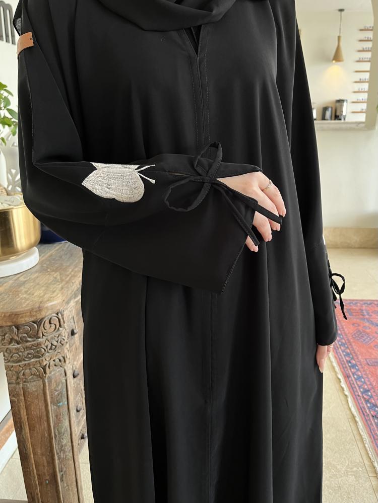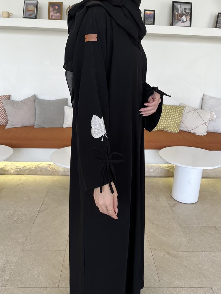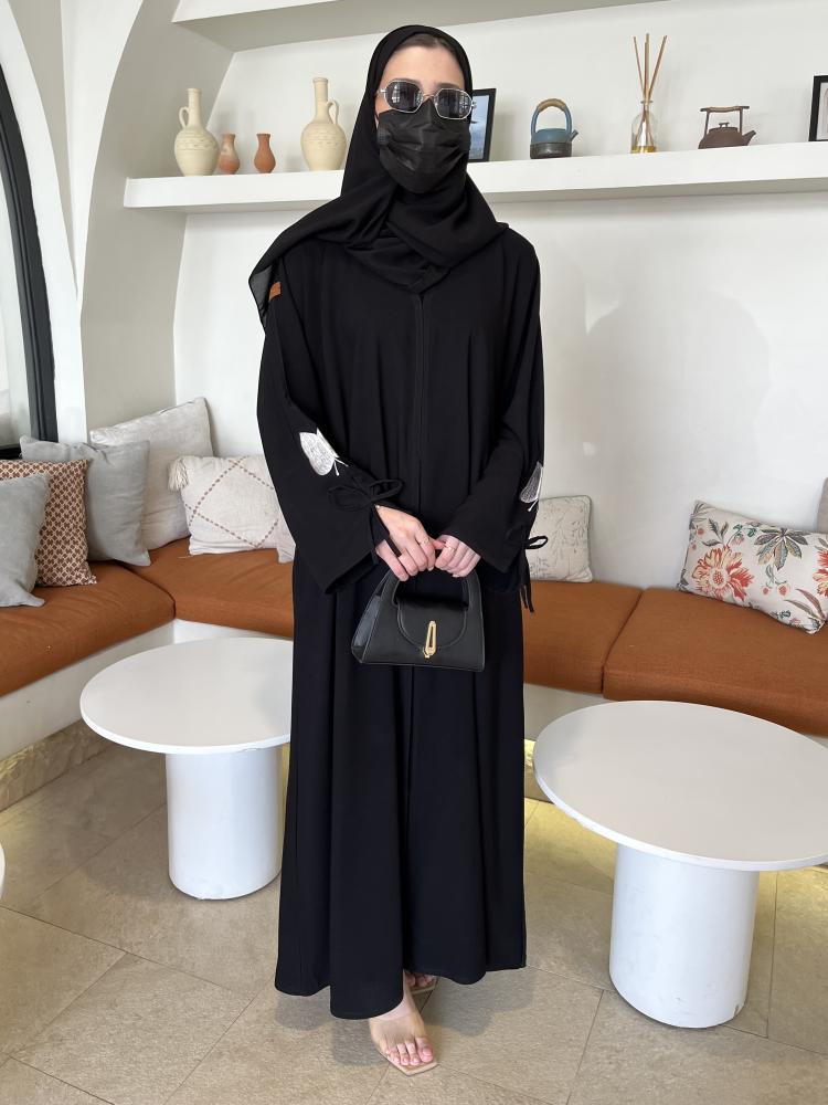 •العباية الكم تطريز بيج فاتح وفيونكة سوداء ثابتة .