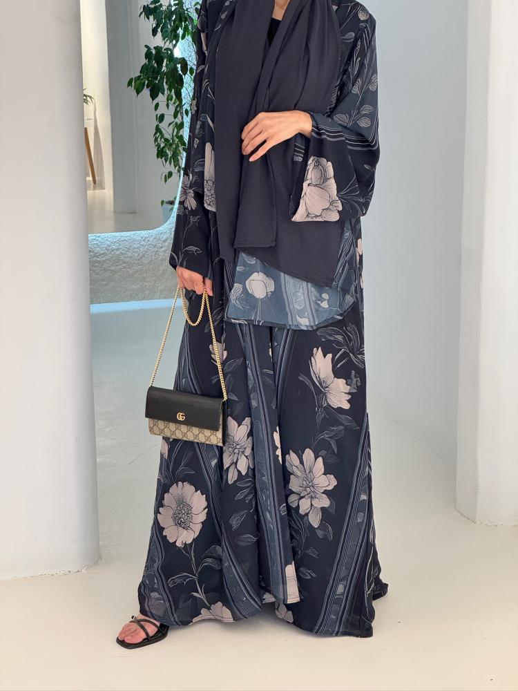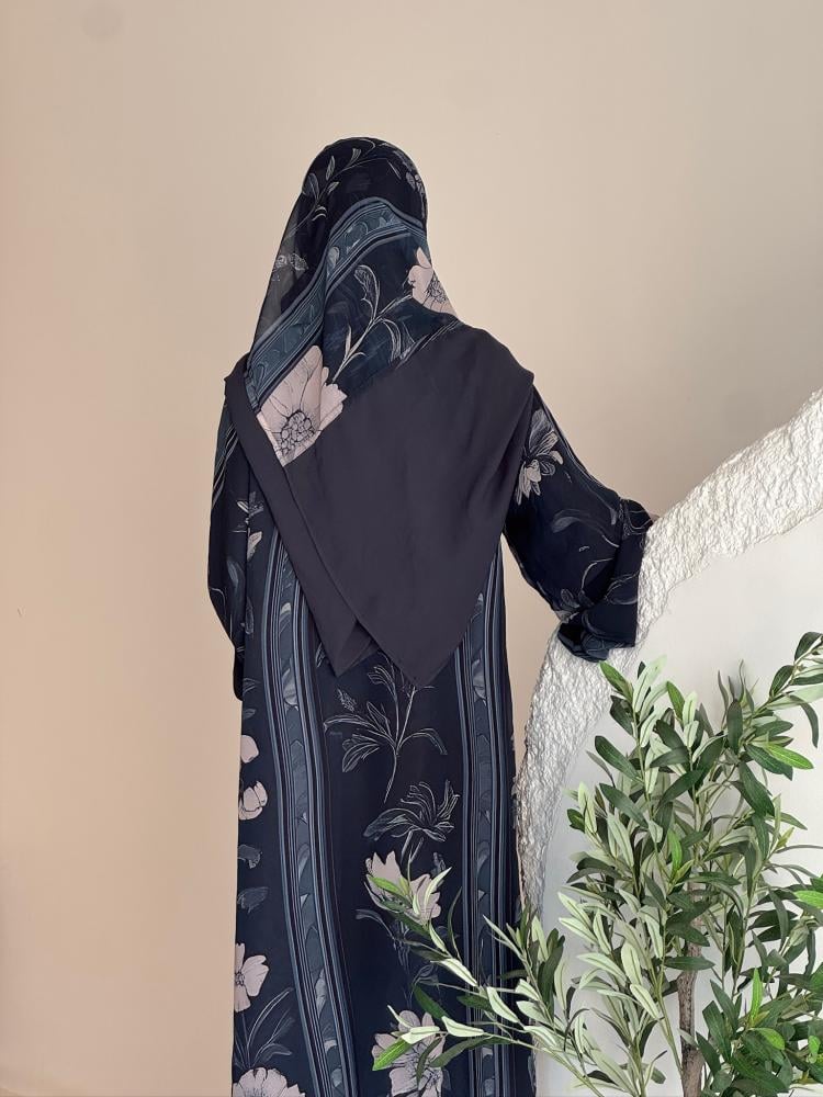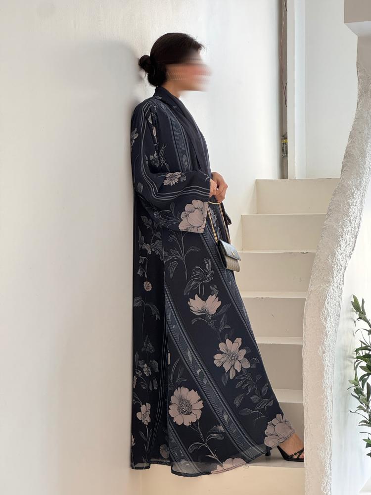 عباية كحلية راقية مطبوعة بنقوش زهرية ناعمة بألوان هادئة متناسقة، مع خطوط طولية رفيعة تمنح التصميم لمسة كلاسيكية أنثوية. قماشها خفيف وانسيابي يضفي إطلالة عصرية مريحة، مناسبة للارتداء اليومي الأنيق أو المناسبات البسيطة
