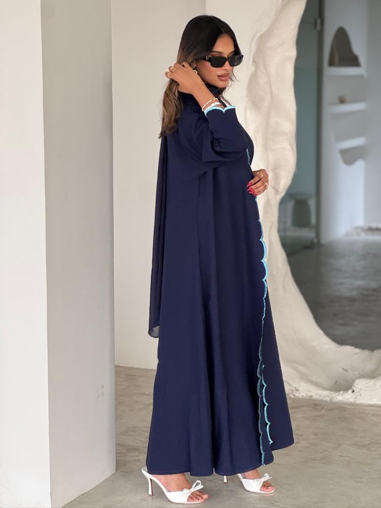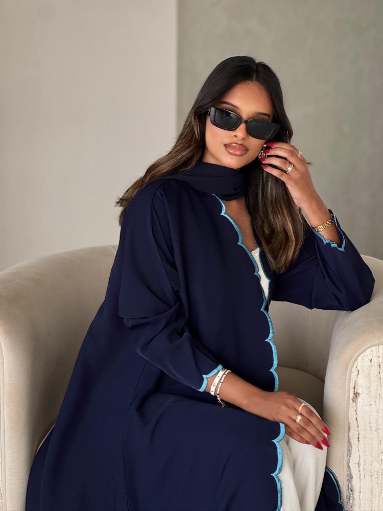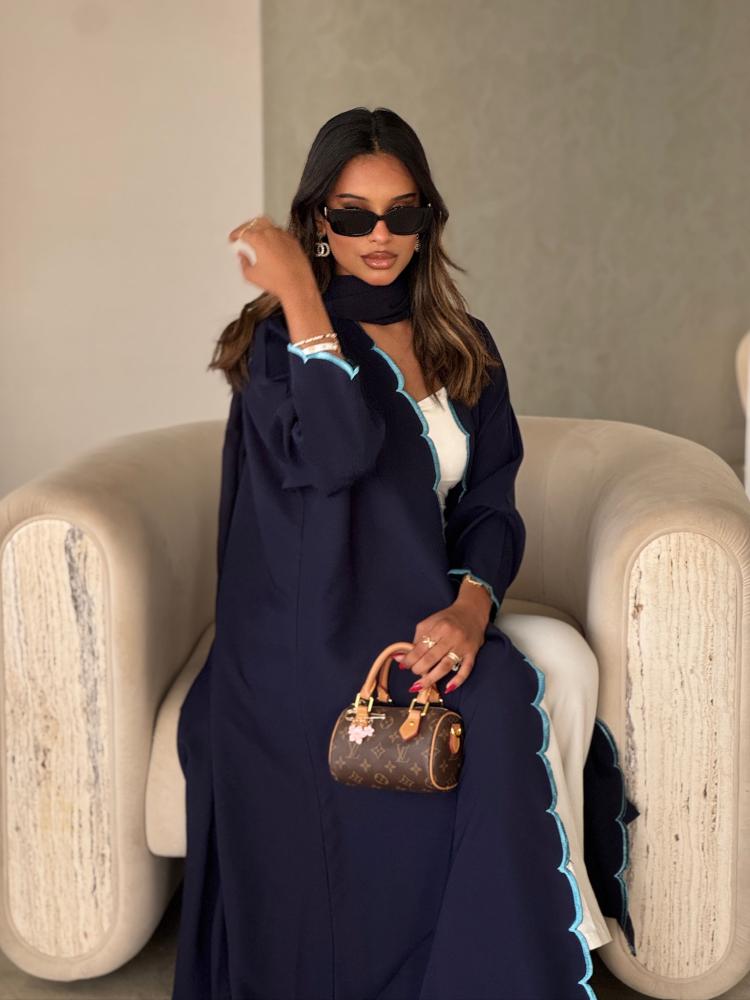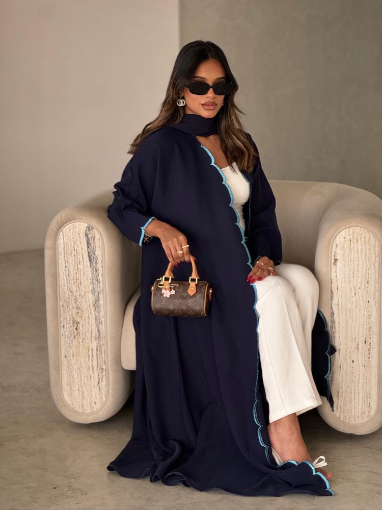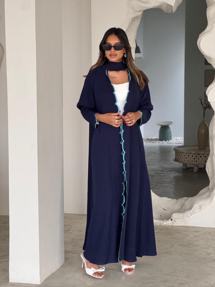 عباية كحلي عميق بتطريز سماوي راقي يزين الصدر من الأمام، يبرز تفاصيلها بفخامة وأنوثة مميزة. قماشها بارد جداً وخفيف، يمنحك راحة وانتعاش طوال اليوم، مثالية للأجواء الحارة مع الحفاظ على الأناقة والرقي في كل مناسبة