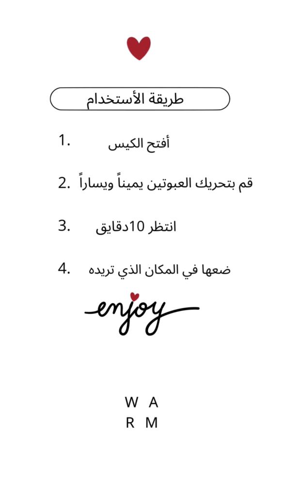 -ما عليك سوى تحريكه يميناً ويساراً ، وسيبدأ في تسخين يديك خلال دقائق ويدوم لمدة 8 ساعات