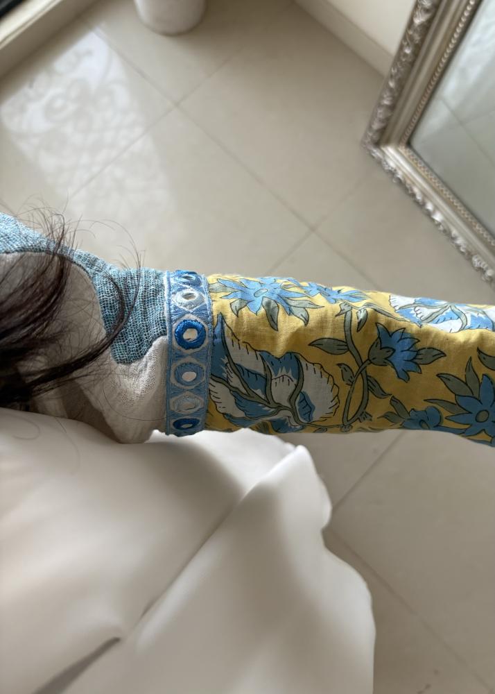 تتألّق بتفاصيل أكمام من قماش القطن الأصفر مزينة بطباعة ورد باللون الأزرق، لإطلالة حيوية ومليئة بالأنوثة.